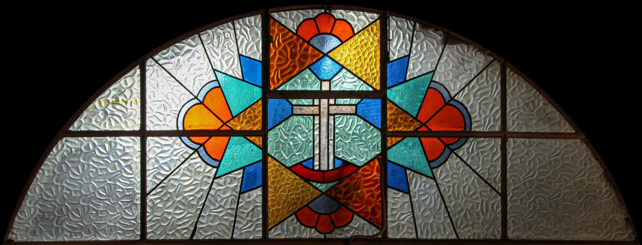 Lunette en arc surbaissé avec au centre une croix posée sur une base concave, érigée au centre d’une grande étoile à six branches à l’intermédiaire et sur lesquelles sont disposés quatre trilobes orange et bleus. Des triangles de deux tons de bleus complètent l’ornementation.