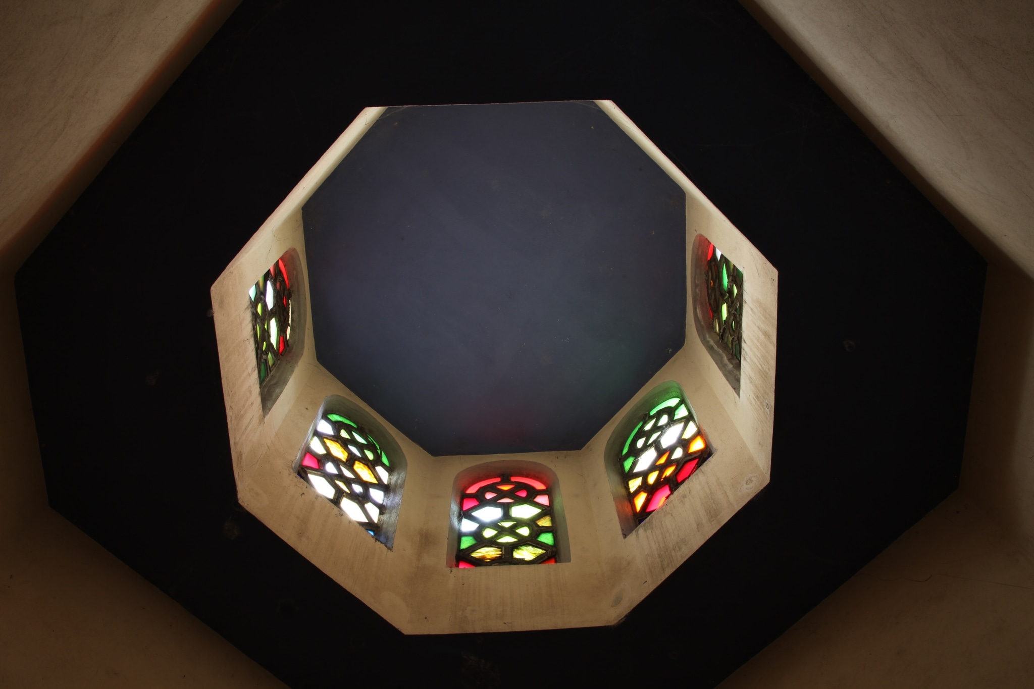 Ensemble de cinq fenêtres réparties sur cinq des pans du lanternon octogonal couronnant le baptistère. Ces fenêtres sont composées d’un claustra de ciment formé de losanges et de cercles entrecroisés, dans les jours duquel s’enchâssent des pièces de verre coloré. Contrairement aux fenêtres similaires du lanternon de la cage d’escalier au sud, dont les couleurs sont pastel, les teintes des verrières du baptistère ne suivent pas de schéma répétitif, et présentent une palette de teintes franches : rouge, orange, jaune, vert, bleu foncé et clair. Certains des verres utilisés sont irisés.