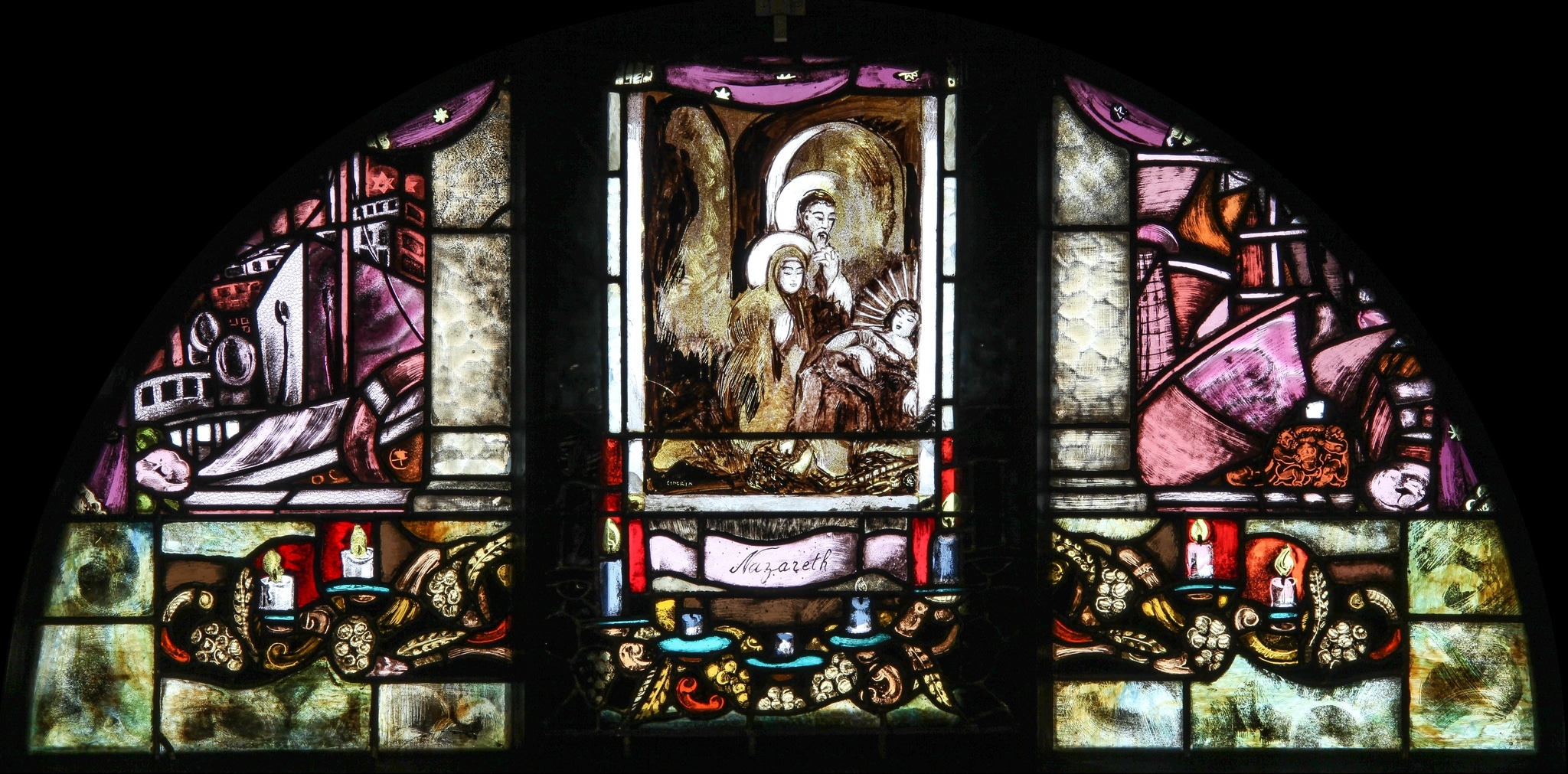 Pour ce cycle de six verrières consacrées à la Vierge, Cingria joue avec les plans et différents niveaux de réalité, pour donner l’impression que la scène figurée au centre est un tableau de retable intégré au sein d’un autel dont l’avant serait situé juste sous les yeux du spectateur. Partiellement recouvert d’un rideau, ce retable est encadré de deux pans de parois traité avec un verre imitant la texture du marbre, tout comme la table d’autel. A l’arrière-plan, l’artiste emporte le regard du spectateur vers des paysages étranges, où différents éléments figuratifs s’entremêlent avec une grande richesse inventive. Contrastant avec le reste du vitrail présentant des verres aux multiples textures et effets, la scène centrale correspondant au retable se compose de peinture à la grisaille et au jaune d’argent sur un fond de verre transparent, traité à la manière d’une peinture.
