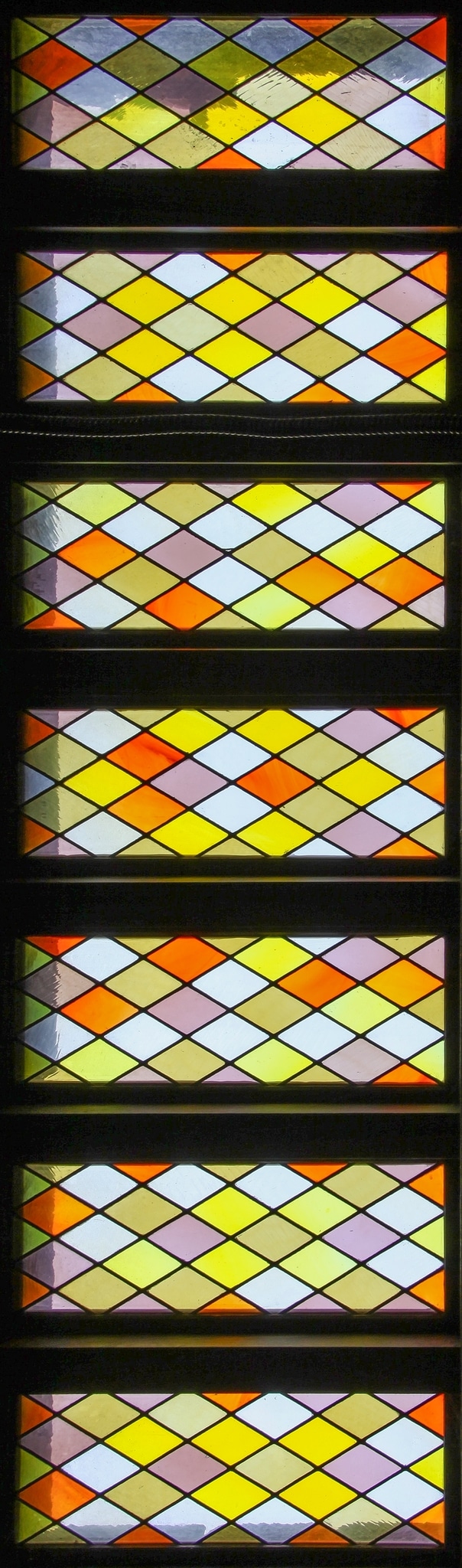 Ensemble de sept fenêtres rectangulaires ornementales losangées colorées, dans des teintes pastel de jaune, vert, beige, taupe et bleu pâles, relevées par endroits de pièces orange plus vives.