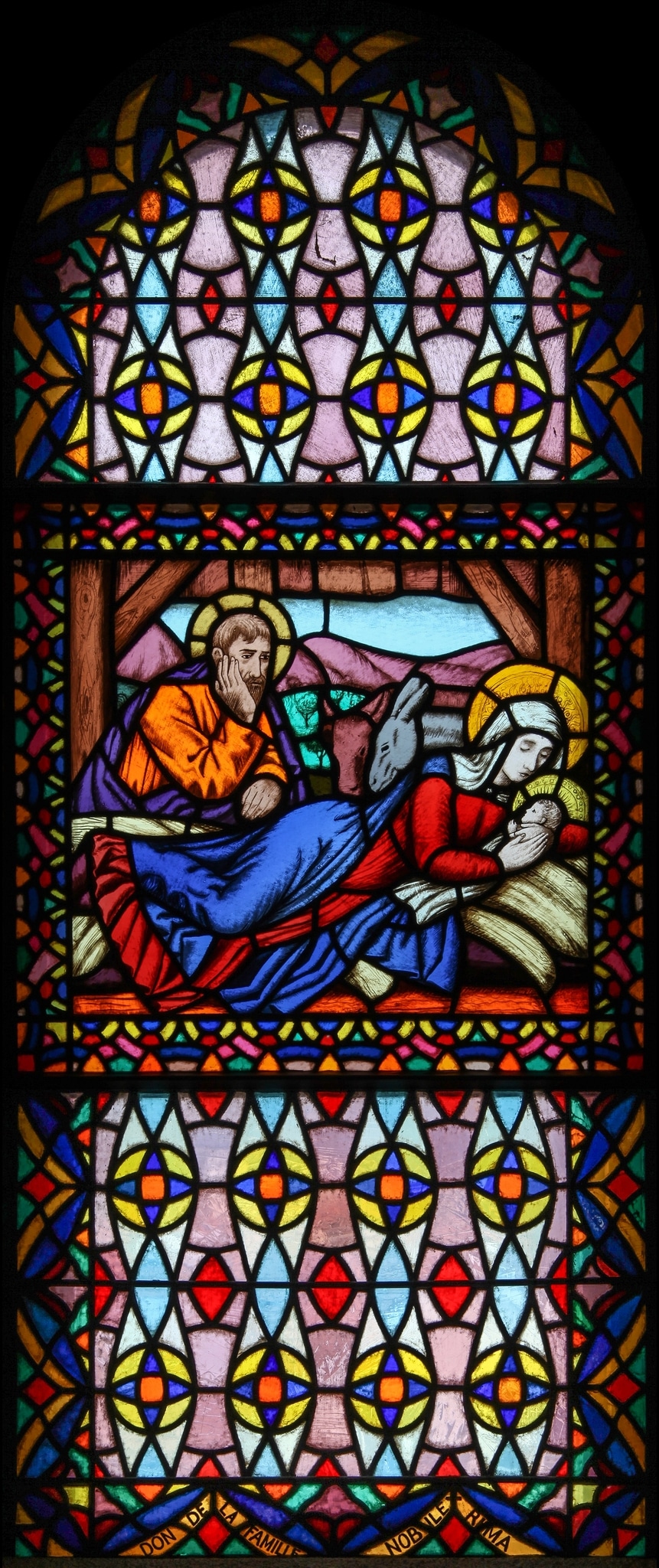 Cette grande verrière mixte conjugue un fond ornemental avec au centre une scène narrative relatant la Nativité.