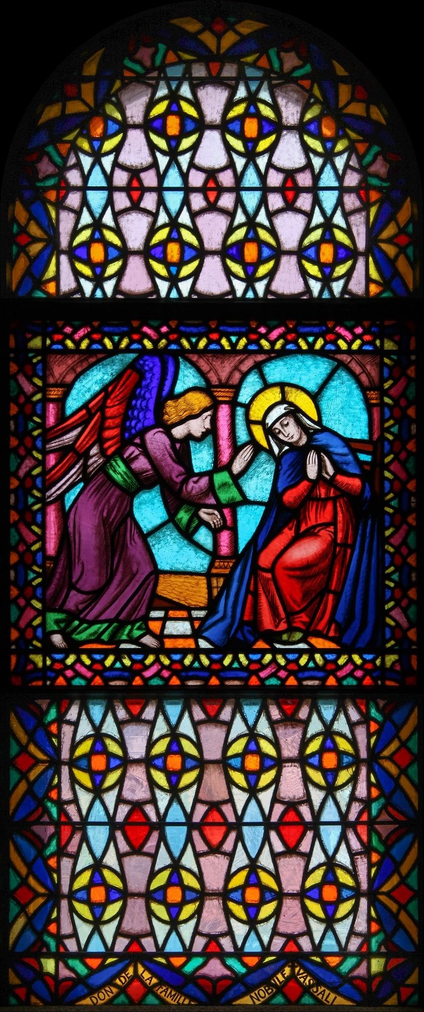 Cette grande verrière mixte conjugue un fond ornemental avec au centre une scène narrative relatant l’Annonciation.