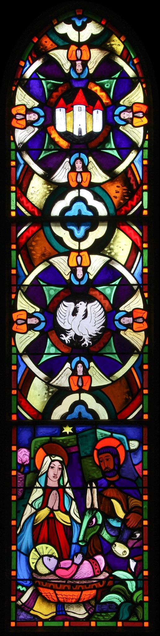Ce vitrail est constitué de trois panneaux superposés: une scène figurée en bas, au-dessus de laquelle sont disposés deux médaillons décoratifs.
