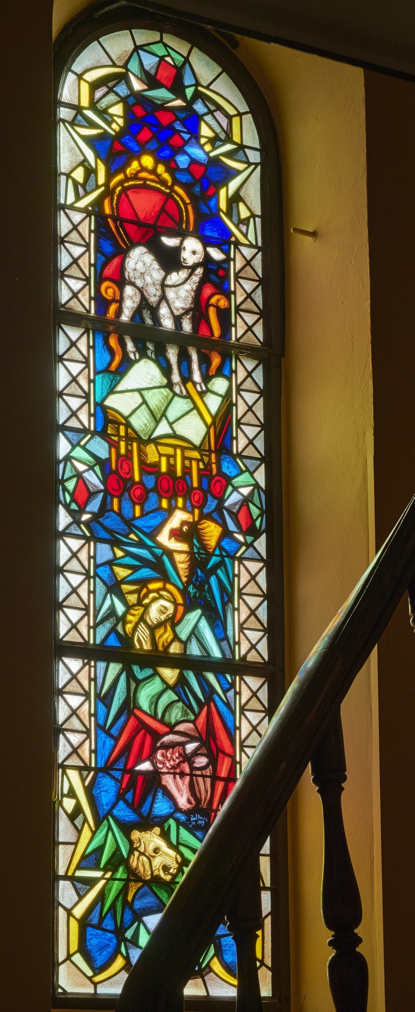 Par rapport aux autres vitraux, qui suivent tous un schéma identique avec deux scènes narratives superposées ressortant sur un fond ornemental géométrique composé de verres pâles, ce vitrail situé dans l’escalier de la tribune constitue une exception, tout comme celui qui lui fait pendant. Ses dimensions étant plus étroites, Monnier a dû opter pour une construction différente du reste des vitraux de la nef, présentant deux scènes narratives superposées ressortant sur un fond ornemental clair. Il choisit ici d’illustrer différents symboles tirés du livre de l’Apocalypse, qu’il représente en les superposant sur l’ensemble de la fenêtre : l’Agneau devant un trône vide, posé sur un livre comportant sept sceaux, suivi en dessous du tétramorphe, les quatre animaux (l’aigle, l’ange, le taureau et le lion, aussi appelés “quatre vivants”), qui sont liés aux symboles des quatre Évangélistes. L’artiste fait visuellement le lien avec le reste du cycle en choisissant une bordure similaire, ornée de motifs de pierres précieuses.