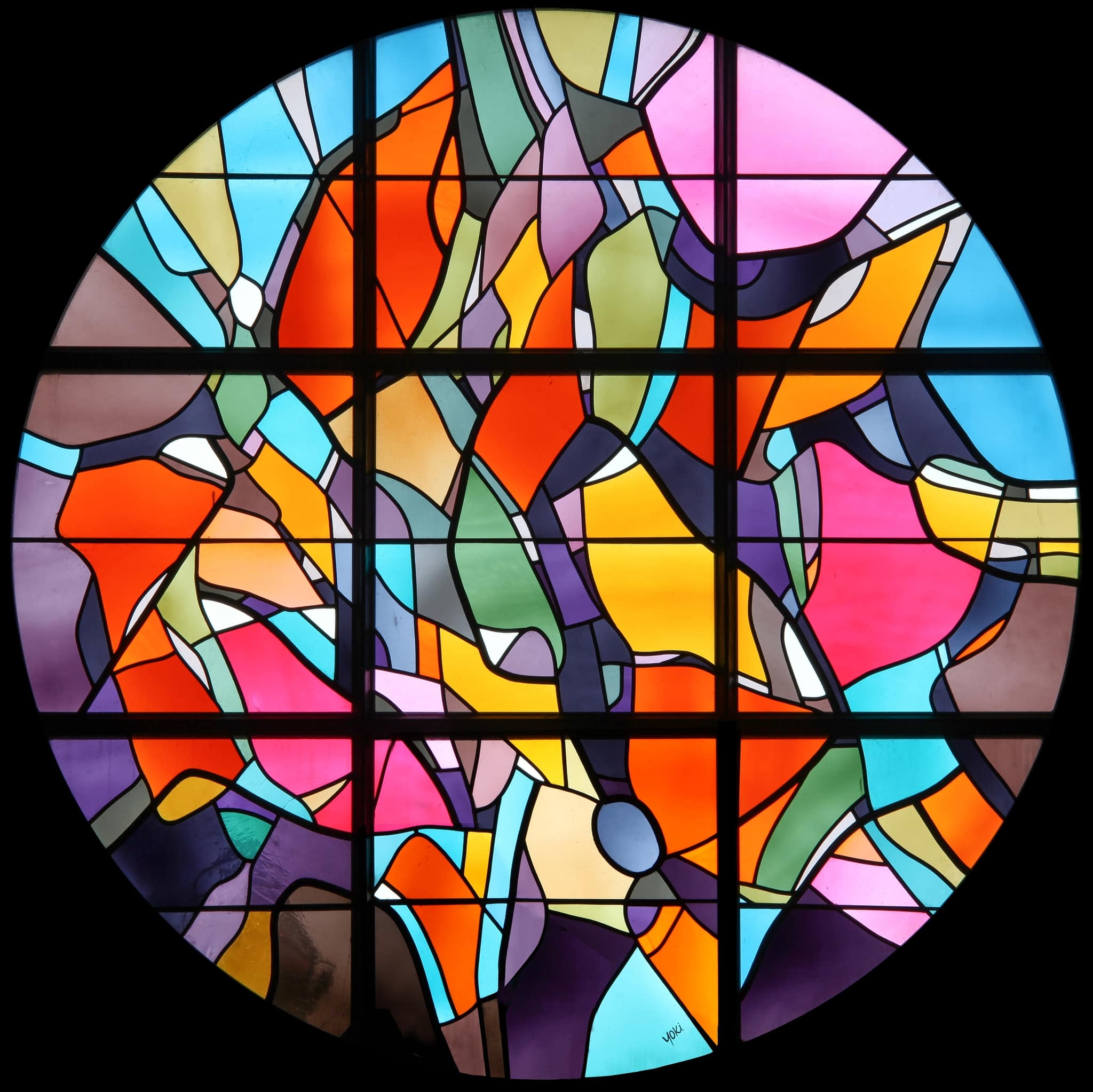Imaginé dans des couleurs vives, ce Buisson ardent de Yoki (Lereche, 1984) reprend les coloris des deux vitraux de Cingria dans le choeur (jaune, vert, brun, turquoise, orange, rose) mais l’artiste les associe dans un ordre d’importance différent, conférant un équilibre entre teintes chaudes et froides. L’artiste crée principalement des formes géométriques de grande taille, parfois tortueuses, dont certaines lignes sont mises en valeur grâce à l’usage de plombs plus larges. Aucune pièce de verre n’apparaît figée ou statique, elles s’entrecroisent et se chevauchent, tandis que des petites pièces de verre transparent ou très clair apportent une forme de souffle à cet ensemble aux couleurs vives.