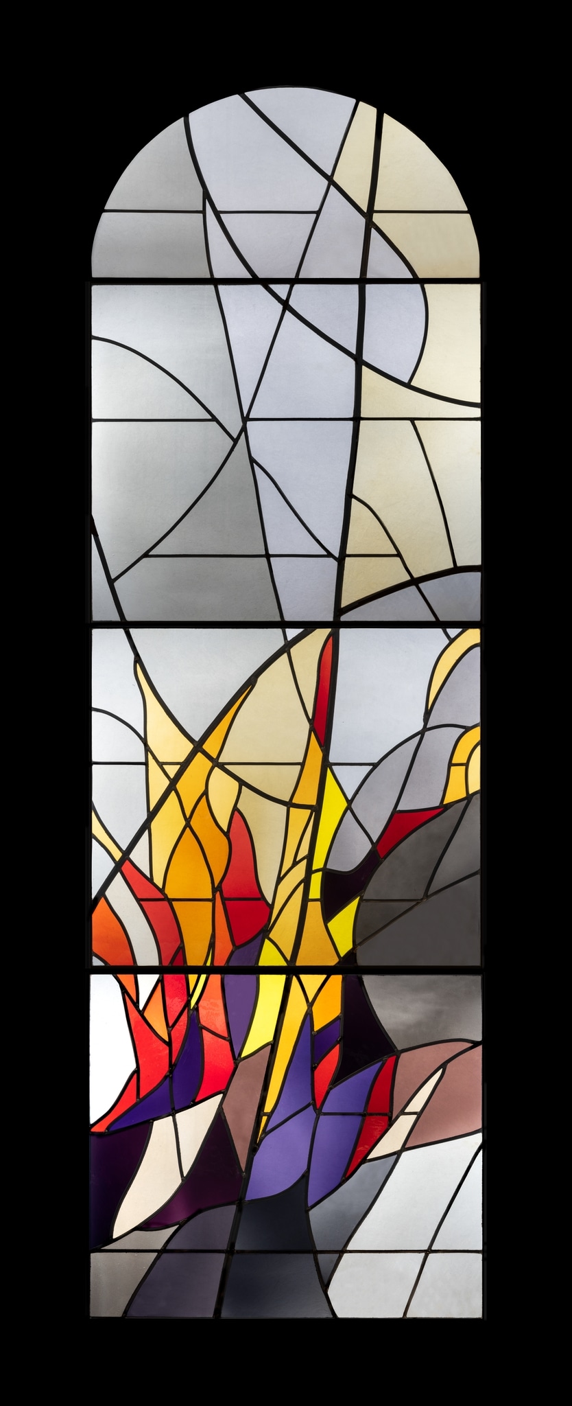 Elle décide de faire commencer la lecture du cycle à l’entrée de la nef, désireuse que le dernier vitrail, évoquant la mort, domine le choeur. Elle envisage la succession de ses verrières ainsi : “Frère Soleil s’arrache à la nuit dans un feu de teintes chaudes, la lune le suivant dans un ciel sombre d’astres éclatés. Puis souffle le Vent bleu et noir sur les monts. L’eau ruisselle en diagonale diaphane avant que le Feu n’embrase le vitrail suivant. Viennent les fruits, posés dans le cercle de la Terre. Ils sont la vie qui renaît de la mort. La Mort clôt l’émerveillement de François et donne sens à cette succession, non pour l’anéantir mais pour ouvrir une porte vers la lumière. Les Flammes de la Résurrection sont jetées sur l’ombre de la planète. Celles-ci s’élèvent à travers la Croix glorieuse. Les couleurs du premier vitrail sont en partie reprises, alors que le rythme des plombs de l’ensemble écrit dans le ciel l’unité de la vie” (Tabin-Darbellay, 2021, p. 18).