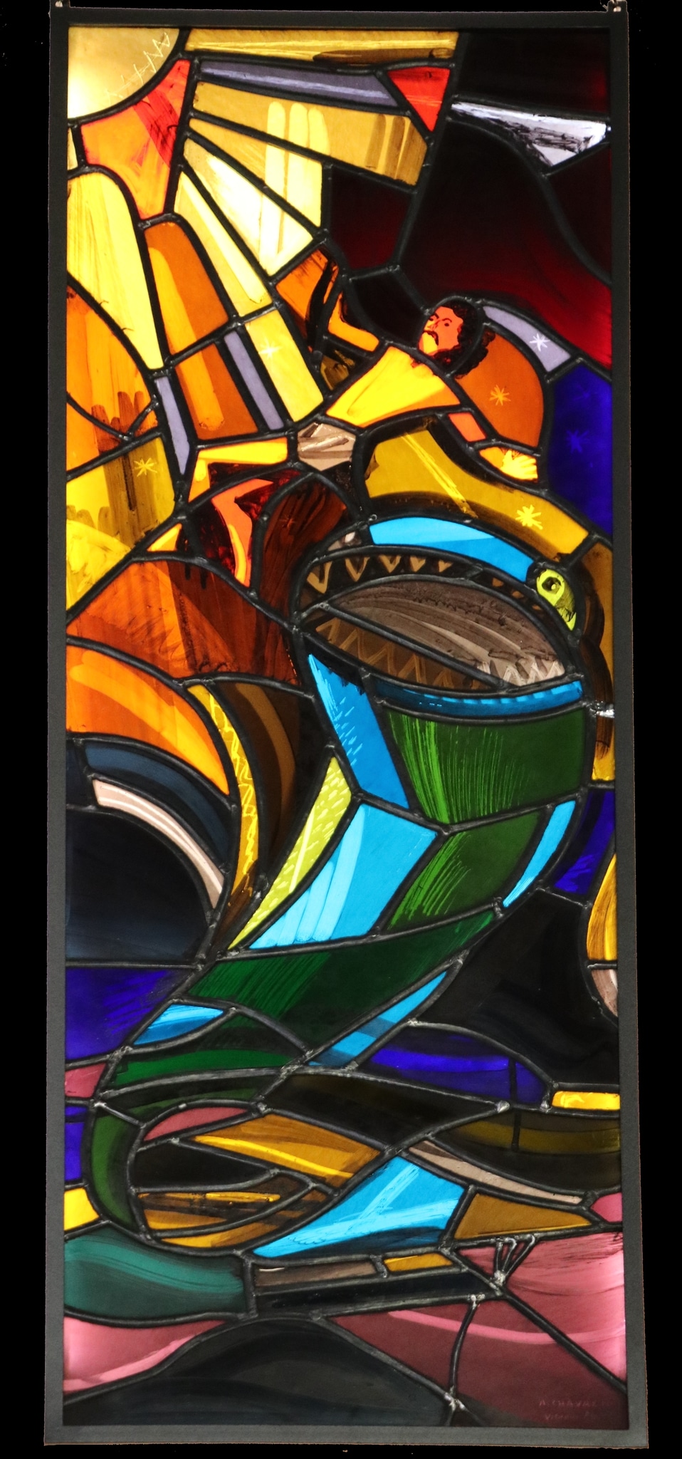 Ce vitrail représentant Jonas sortant de la gueule de la baleine est l’oeuvre de l’artiste valaisan Albert Chavaz, en collaboration avec l’atelier fribourgeois Herbert Fleckner. Commandé par la paroisse de Saint-Martin en Valais en 1957 pour orner la fenêtre du baptistère, il a été réalisé quelques années après la construction du nouvel édifice par les architectes Fernand Dumas et Denis Honegger.