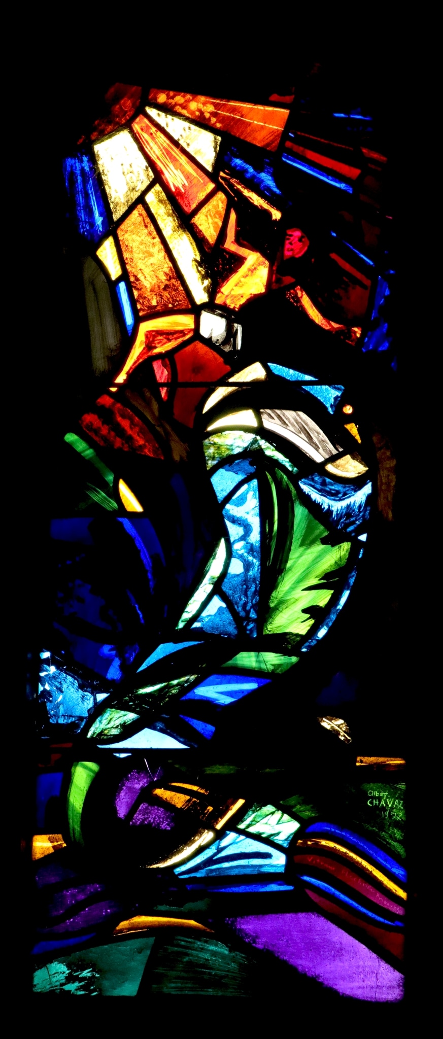 La même année, Chavaz termine son travail pour le chemin de croix en vitrail sans plomb qu’il réalise pour l’église du Christ-Roi au Petit-Lancy (par exemple GE_105.10). Bien que la technique utilisée à Genève soit différente, nous pouvons néanmoins voir des similitudes entre ces deux réalisations. Chavaz travaille à chaque fois avec des pièces de verre plutôt grandes par rapport à la taille de l’oeuvre, ce qui l’amène à envisager une structure formelle simple et efficace, n’entourant le sujet d’aucune fioritures ou détails inutiles.