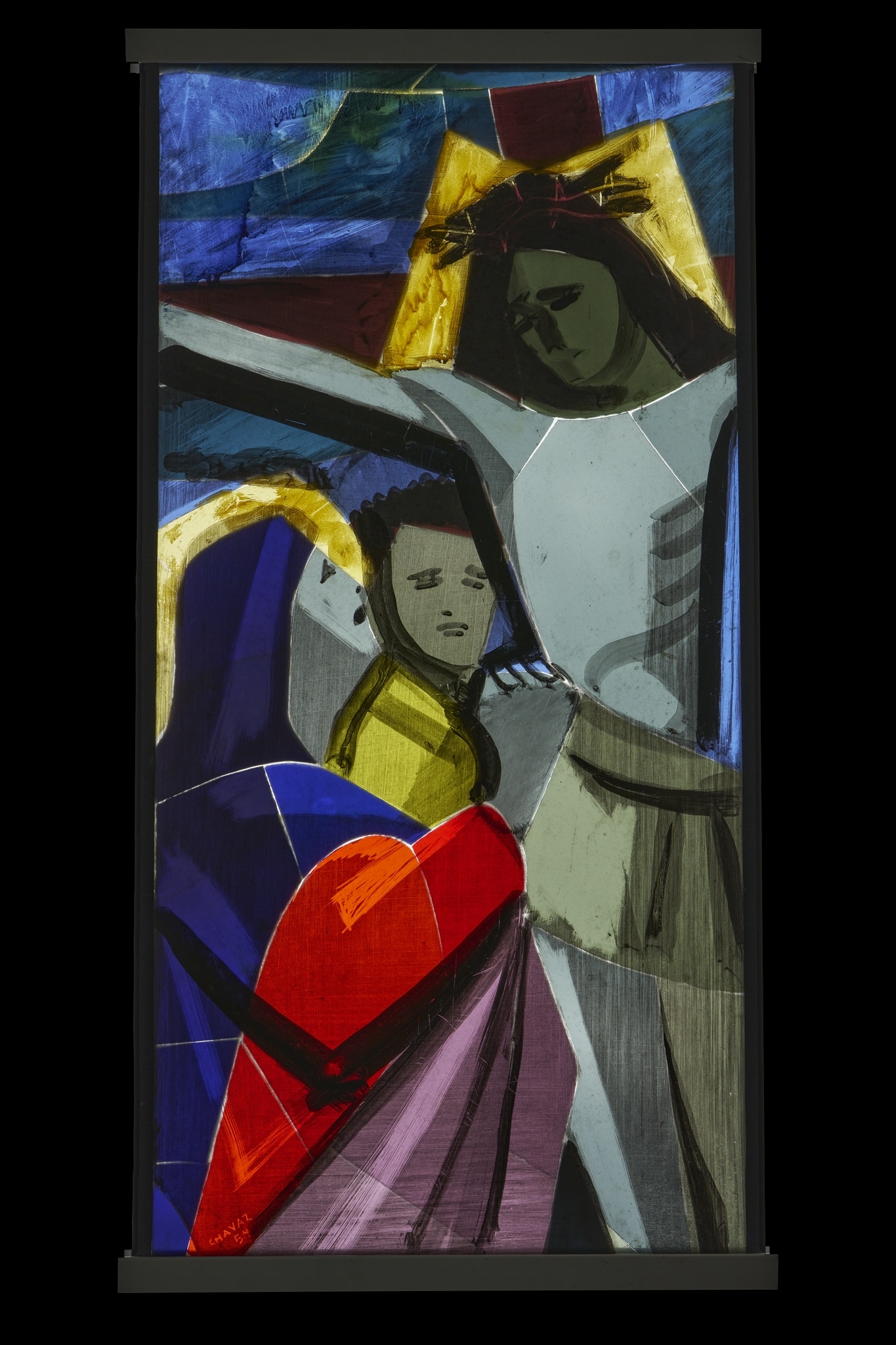 En avril 1954, les grands vitraux à losanges sont presque tous posés, adoucissant non seulement l’atmosphère de l’église mais semblant aussi agrandir l’espace intérieur. En octobre, Chavaz vient poser deux stations du chemin de croix à titre d’essai, dont ce panneau, pour vérifier que les teintes choisies se marient avec les verrières de Dunand et le reste de l’église (Bulletin paroissial, 1954a et b). La paroisse manquant d’une grande part du budget pour ces oeuvres, elle ne peut commander fermement les verrières à l’artiste. Elle lui demande néanmoins de dessiner les cartons et l’assure que c’est lui qui les réalisera (Chamay, 1955a et b). Chavaz propose de faire d’autres essais. Pour équilibrer l’ensemble, il souhaite réaliser les quatorze stations simultanément (Chavaz, 1955). La paroisse reçoit une subvention de la Fondation Gleyre, à la condition de pouvoir se faire un avis sur la qualité des oeuvres graphiques de l’artiste (Chamay, 1956). En décembre 1956, Chavaz et Herbert Fleckner viennent donc apporter les maquettes à la paroisse et poser quatre verrières pour contrôler les teintes in situ (Chavaz, 1956). L’ensemble des vitraux est posé en mai 1957 (Chamay, 1957). Sur le conseil de Chavaz, quelques pièces de verre des fenêtres à losanges apportant une lumière trop vive sont assombries avec une couleur opaque (Chavaz, 1957).