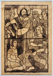 Ce carton en noir et blanc à l’échelle 1:1 est le projet définitif pour la première scène depuis le haut du huitième vitrail à droite de la nef de l’église Saint-Pierre de Fribourg, consacré à saint Paul. Elle est tirée des Actes des apôtres (Ac 9:1-30).