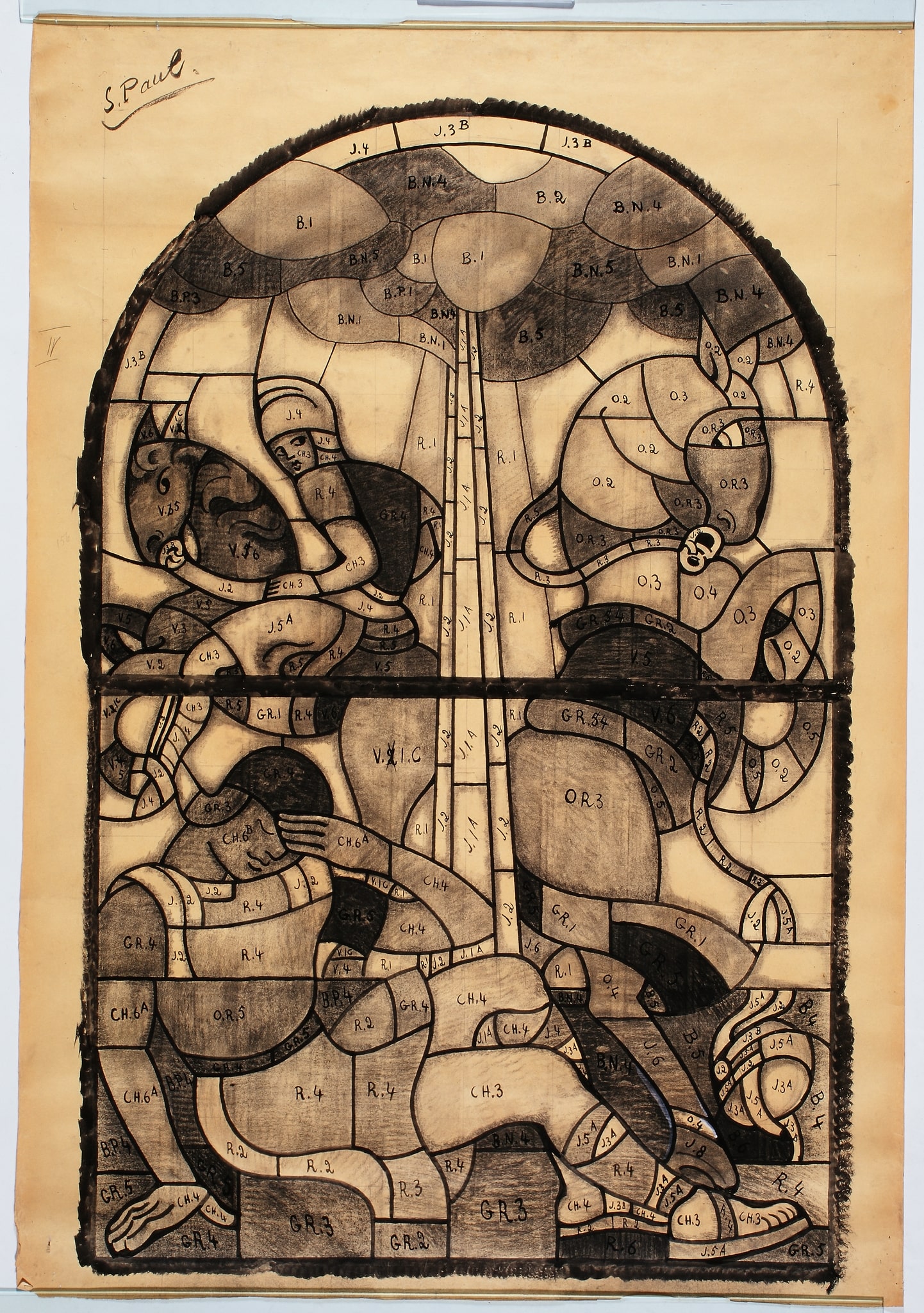Le fonds graphique de l’atelier Kirsch & Fleckner, conservé au Vitrocentre Romont, comprend les cartons de l’ensemble de cette verrière dédiée à saint Paul, qui sont tous en noir et blanc (KF_288 ; KF_289 ; KF_290 ; KF_291). Pour ce projet définitif, comme pour celui consacré à la scène de la prédication (KF_289), Castella travaille avec des nuances de gris pour différencier les tons chauds et froids, alors que pour les deux autres, il a dépeint uniquement les contours définissant son dessin.