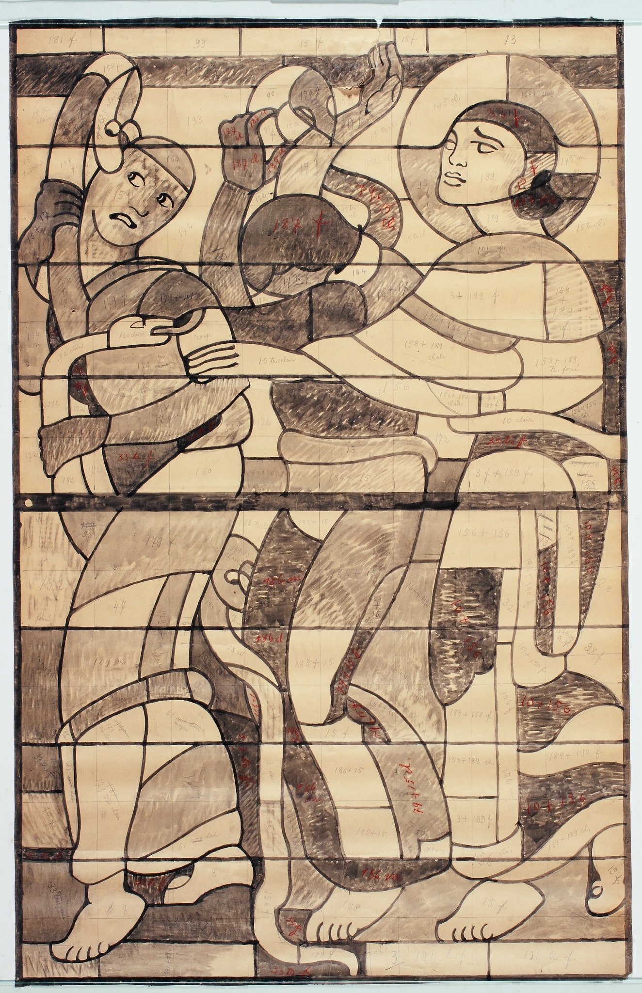 Ce carton en noir et blanc à l’échelle 1:1 est le projet définitif pour la deuxième scène depuis le haut du troisième vitrail de gauche de la nef de l’église Saint-Pierre de Fribourg, consacré à saint Jude Thaddée. Elle est tirée de la Légende dorée de Jacques de Voragine (de Voragine, 1902, p. 230).