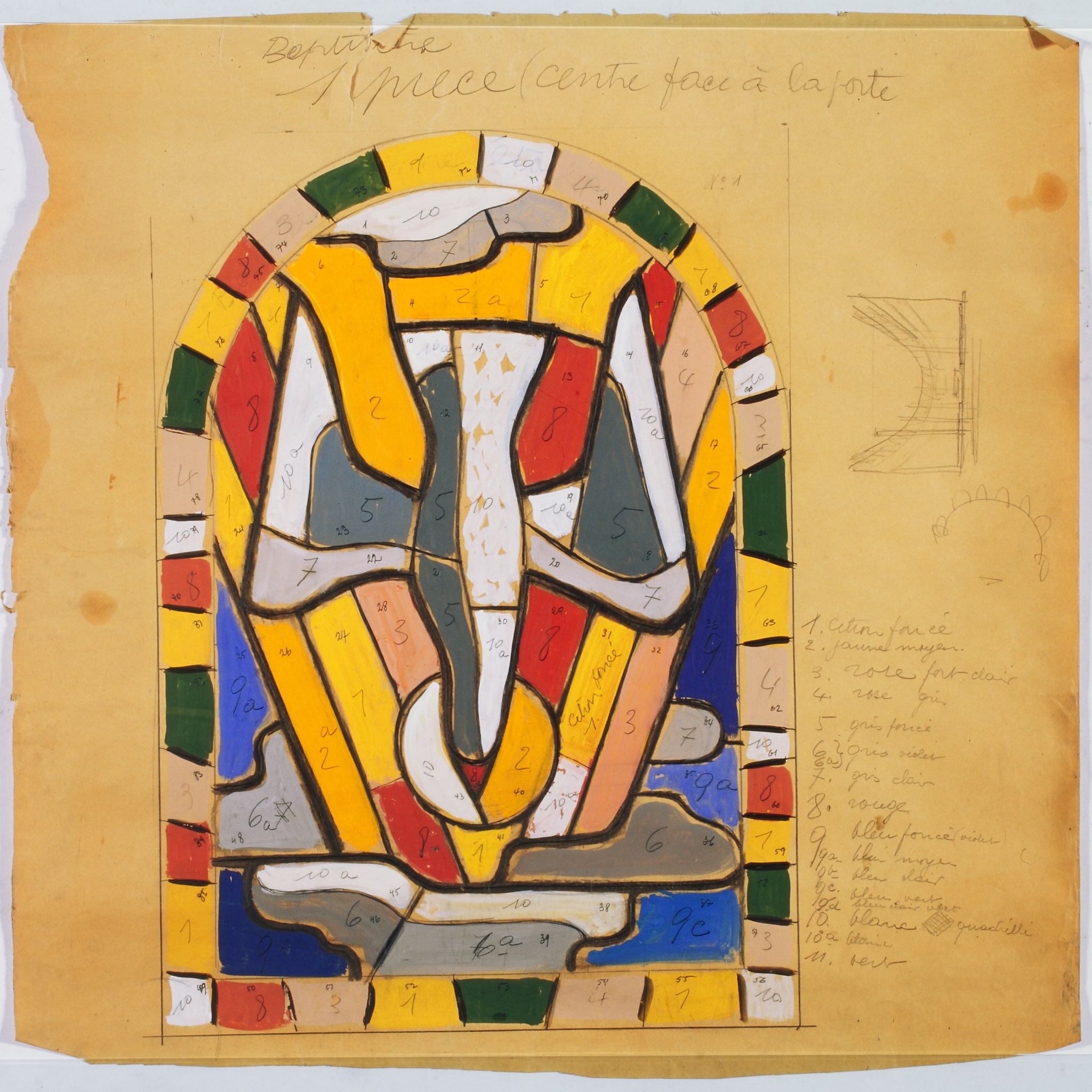 Bien que le dessin de ce carton soit en couleur, Jordan a indiqué dans la marge, selon une numérotation allant de 1 à 11, les nuances précises qu’il souhaitait pour chaque couleur.