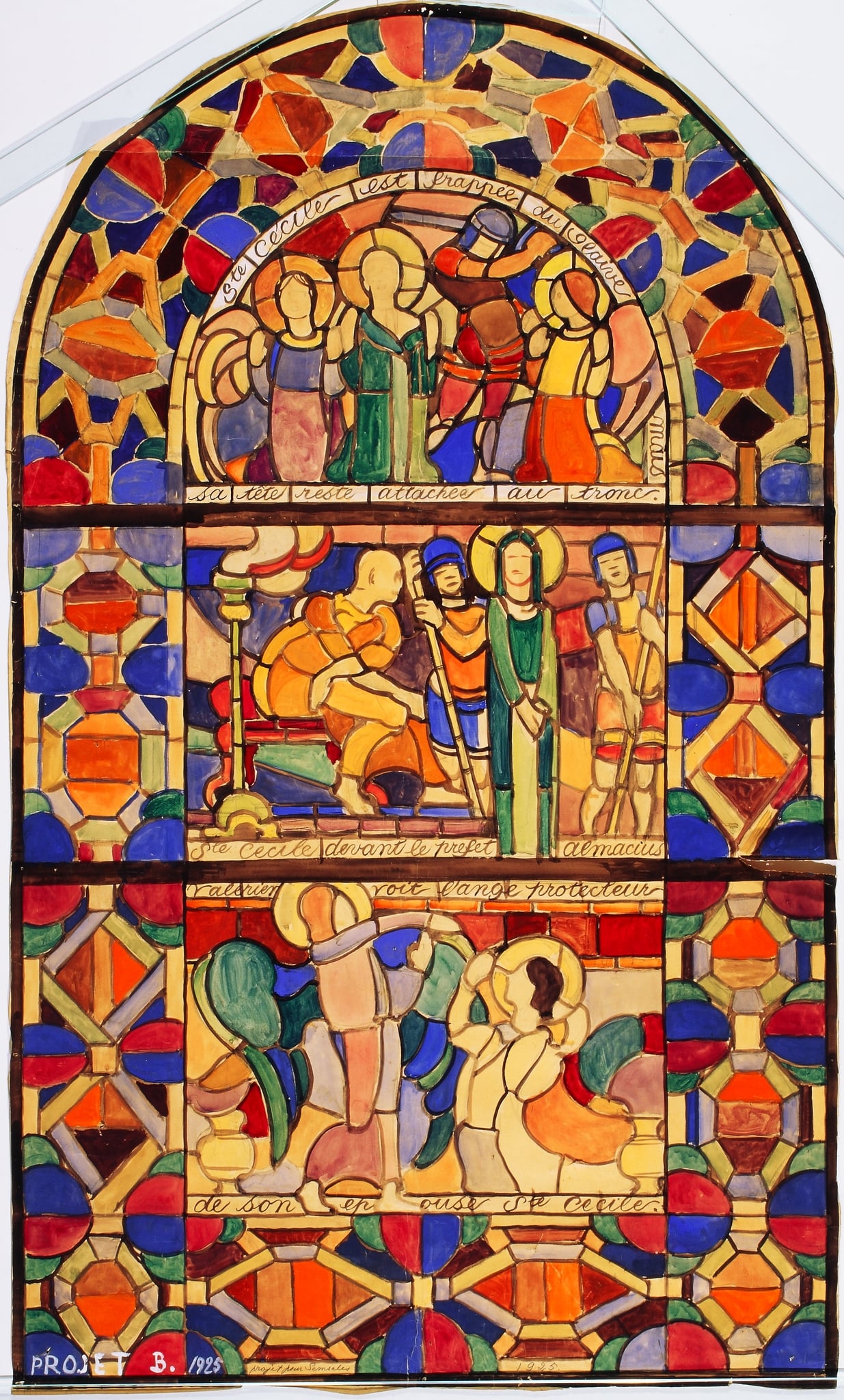 Ce carton en couleur est le troisième des quatre projets que Jean-Edouard de Castella réalise pour le vitrail consacré à la vie de sainte Cécile pour la cinquième fenêtre du bas-côté nord-est de la nef de l’église Saint-Nicolas de Semsales.