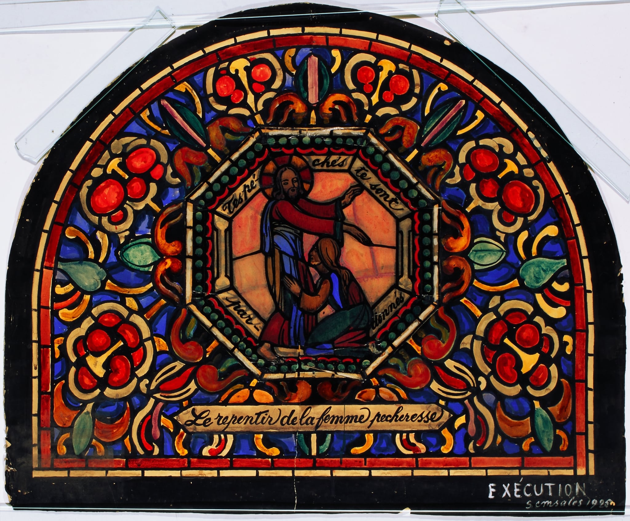 Ce carton en couleur est le dessin définitif à l’échelle 1:1 pour le vitrail consacré à Marie l’Égyptienne situé dans la quatrième fenêtre du bas-côté nord-est de la nef de l’église Saint-Nicolas de Semsales, comme le confirme l’inscription en bas à droite (“Exécution Semsales 1925”). Il a été réalisé par l’artiste Jean-Edouard de Castella.