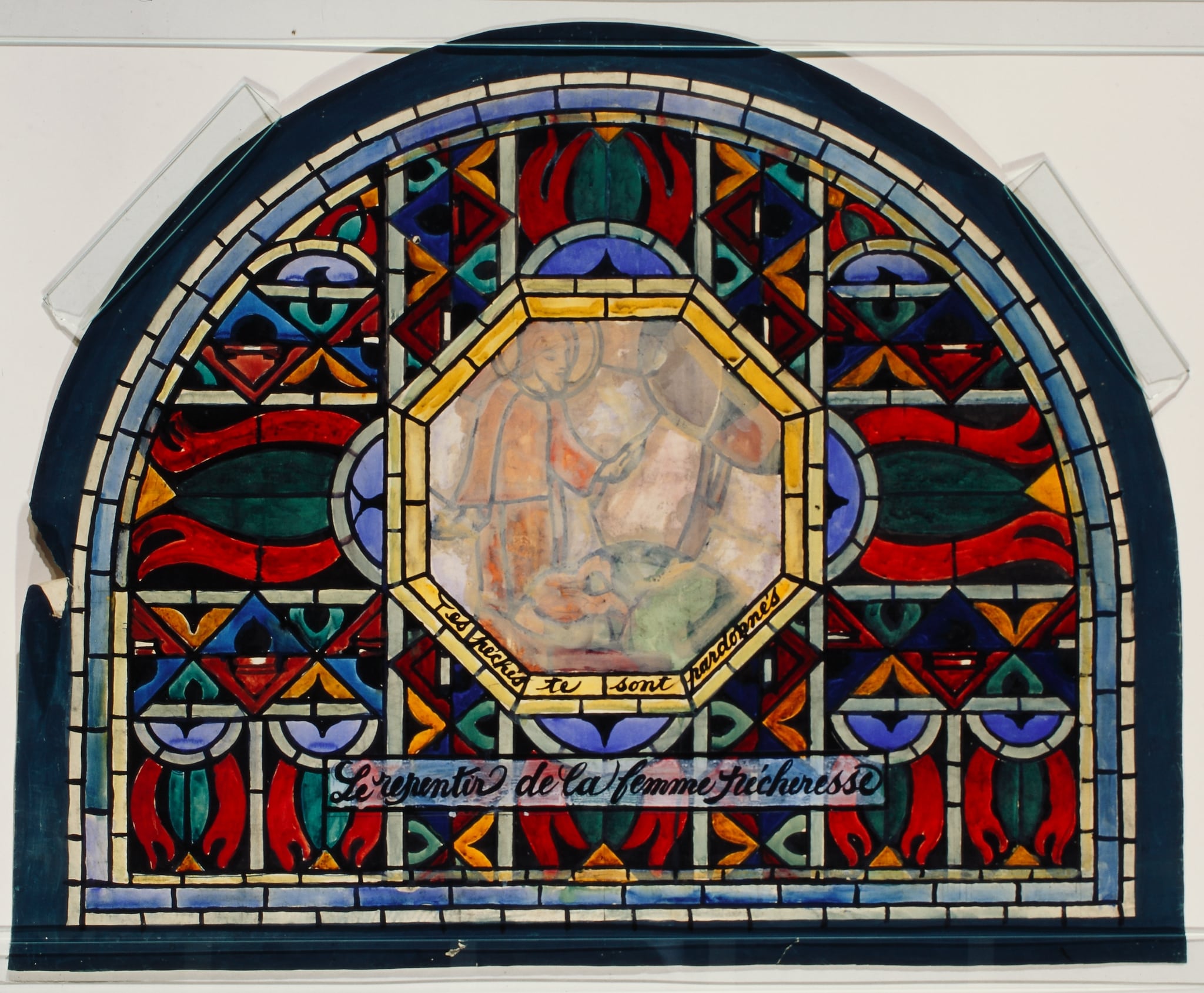 Ce dessin présente un fond ornemental, plus géométrique que végétal, associant des coloris identiques au vitrail mais avec d’autres dominantes. La scène figurée se présente dans un octogone et propose une variation sur le même thème que celui de la verrière : Marie n’est pas en prière, le visage tourné vers le Christ, mais est agenouillée devant lui et lui baise ses pieds. Cette scène narrative, bien que dessinée avec précision et mise en couleur, a été recouverte d’une couche de peinture beige transparente, avec l’intention de la mettre au second plan pour souligner avant tout l’encadrement décoratif.