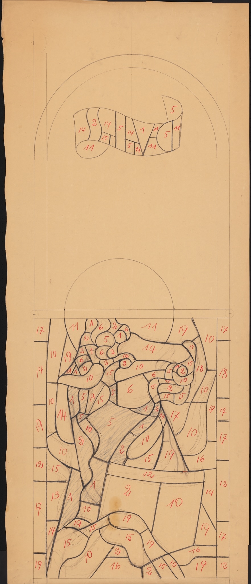Ce carton correspond à la partie supérieure de l’une des quatre baies figurant les symboles des évangélistes de la grande verrière du choeur de l’église Saint-Maurice de Bussy, construite en 1937-1938 par l’architecte phare du Groupe de Saint-Luc, Fernand Dumas (Lauper, 2012. p. 284). L’auteur de ce carton et des trois autres liés à cette grande paroi en vitrail (KF_1062, KF_1063, KF_1590) est l’artiste fribourgeois Willy Jordan. Suite au gain du concours pour la décoration intérieure du sanctuaire, il a réalisé la polychromie générale de l’église ainsi que sa décoration intérieure (Jordan, 1958, p. 2), dont une peinture monumentale dans le choeur, dédiée au martyre de saint Maurice et de la légion thébaine, auquel l’église est dédiée (Lauper 2012, p. 284). Il conçoit également le chemin de croix et les décors du plafond, de la chaire, du maître-autel, de l’autel latéral, des tables de communion, des ornements et des vêtements liturgiques (Jordan, 1958, p. 5).