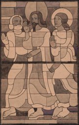 Pérégrination de saint Luc et saint Paul marchant avec le Christ (deuxième scène depuis le haut du vitrail de saint Luc)