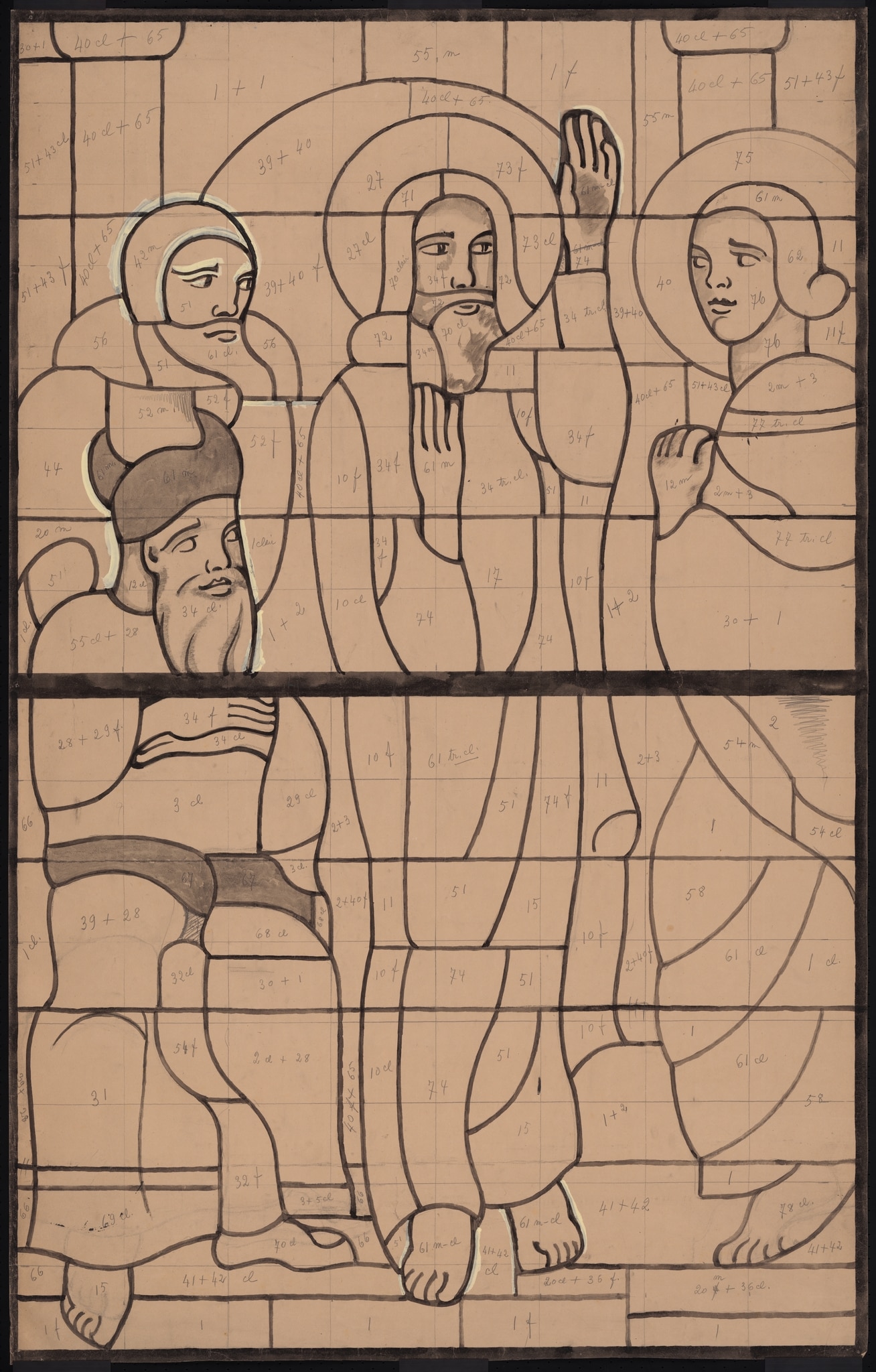 Ce projet définitif consacré à la conversion par Jacques le mineur du grand prêtre Caïphe pour la verrière qui lui est dédiée est en noir et blanc et seuls les contours des personnages sont dessinés, ainsi que quelques zones striées en gris pour indiquer des tons sombres. Il en va de même pour les deux scènes qui la précèdent (KF_1147 et KF_1143). En revanche, celle du bas est en couleur (KF_1152). Ces différences de traitement sont étonnantes, mais nous pouvons supposer que l’artiste ne ressentait pas la nécessité d’apposer la couleur sur chacun des cartons, puisqu’il pouvait s’appuyer sur ses maquettes qui étaient pour la plupart déjà des compositions définitives. Sur chaque carton, les codes couleurs sont mentionnés avec précision pour chaque pièce de verre.