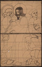 Ce carton illustrant la guérison d’un aveugle par Matthias est en noir et blanc, comme les trois autres projets définitifs liés à la verrière de Matthias (KF_1142 ; KF_1149 et KF_1443), Castella ayant apporté des nuances de gris uniquement sur le visage du saint. Il a indiqué les codes couleur pour chaque pièce de verre et a ajouté des indications concernant les nuances des teintes souhaitées. La maquette correspondant à cette verrière devait certainement être en couleur, mais nous ne savons pas si elle existe encore.