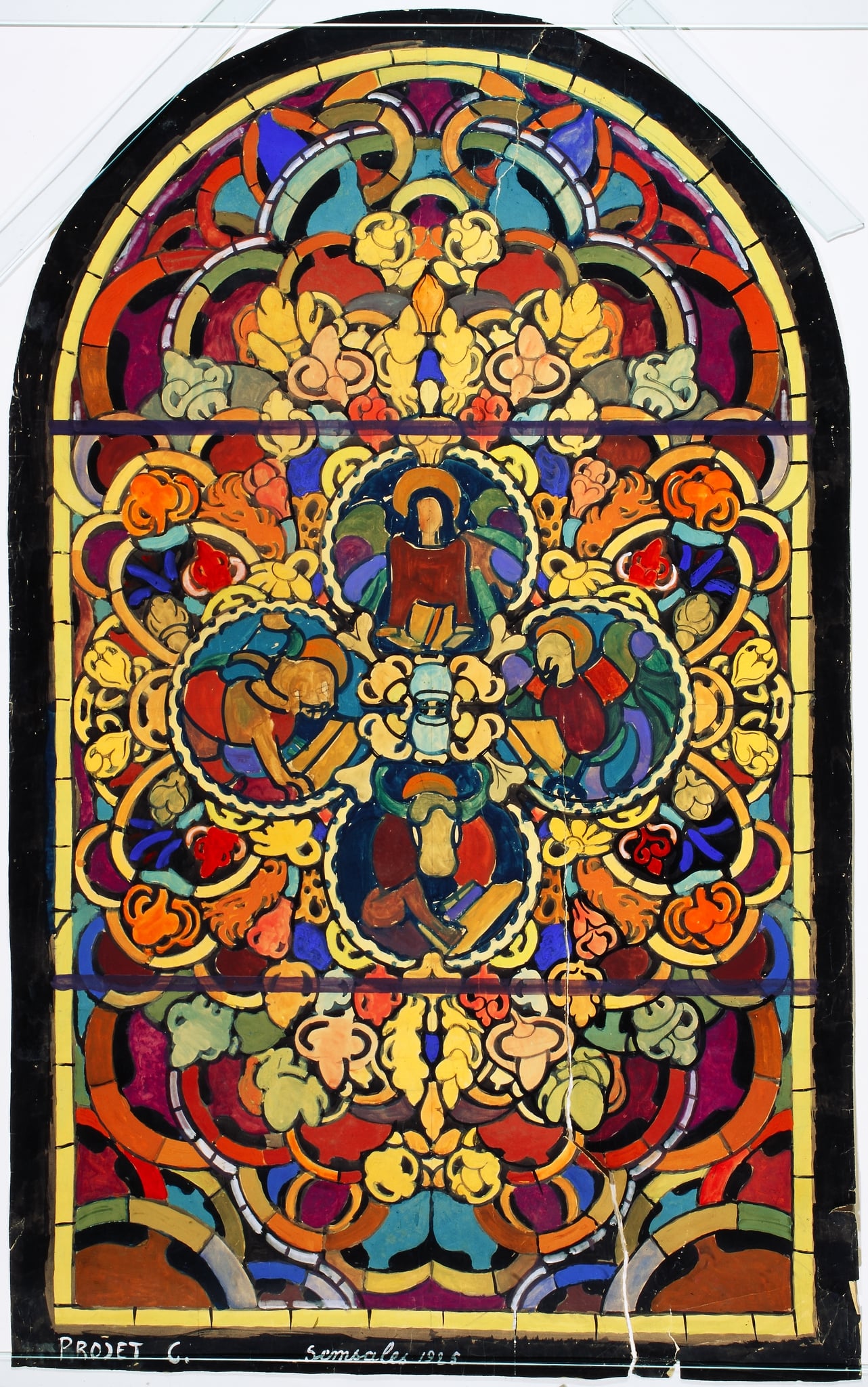 Ce carton en couleur, non retenu, est l’un des premiers projets proposés par l’artiste Jean-Edouard de Castella sur le thème des symboles des évangélistes pour l’un des vitraux des bas-côtés de la nef de l’église Saint-Nicolas de Semsales.