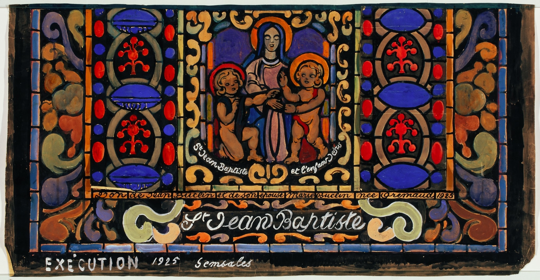 Ce carton correspondant à la partie inférieure du vitrail consacré à Jean-Baptiste présente une scène figurée au centre d’une large bordure ornementale, avec la Vierge assise de face, les mains posées sur ses genoux, entourée de Jean-Baptiste agenouillé et de Jésus jouant ensemble. La large bordure est composée essentiellement d’éléments végétaux et géométriques, ainsi que de volutes.