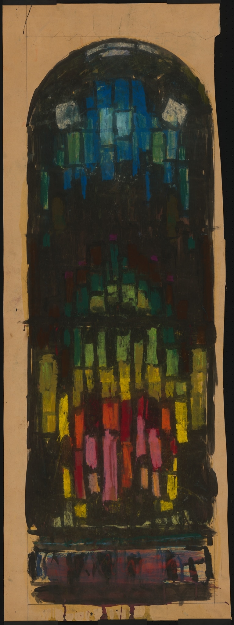 Ce projet appartient à un ensemble d’oeuvres graphiques dont une partie provient du fonds de l’atelier fribourgeois Kirsch et Fleckner conservé au Vitrocentre Romont (KF_1303, KF_1304, KF_1305 et KF_1306), complété par quatre maquettes issues des collections du Vitromusée (VMR_1226_a, VMR_1226_b, VMR_1226_c et VMR_1226_d). Ces oeuvres dévoilent les étapes du processus créatif à l’origine de ces verrières. Il manque plusieurs des cartons et maquettes correspondant à ce cycle.