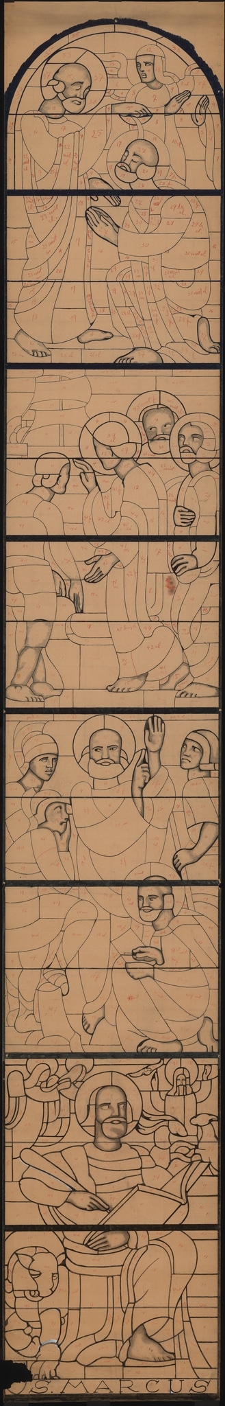 Ce carton en noir et blanc à l’échelle 1:1 est le projet définitif pour l’ensemble du quatrième vitrail à droite de la nef de l’église Saint-Pierre de Fribourg, consacré à saint Marc. La première scène est tirée de la Légende Dorée de Jacques de Voragine (de Voragine, 1902, p. 461). Les seize vitraux de la nef sont l’oeuvre de l’artiste Jean-Edouard de Castella et de l’atelier fribourgeois A. Kirsch & Cie (Arnaud et Pajor, 2008, p. 54-62).