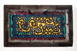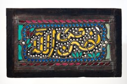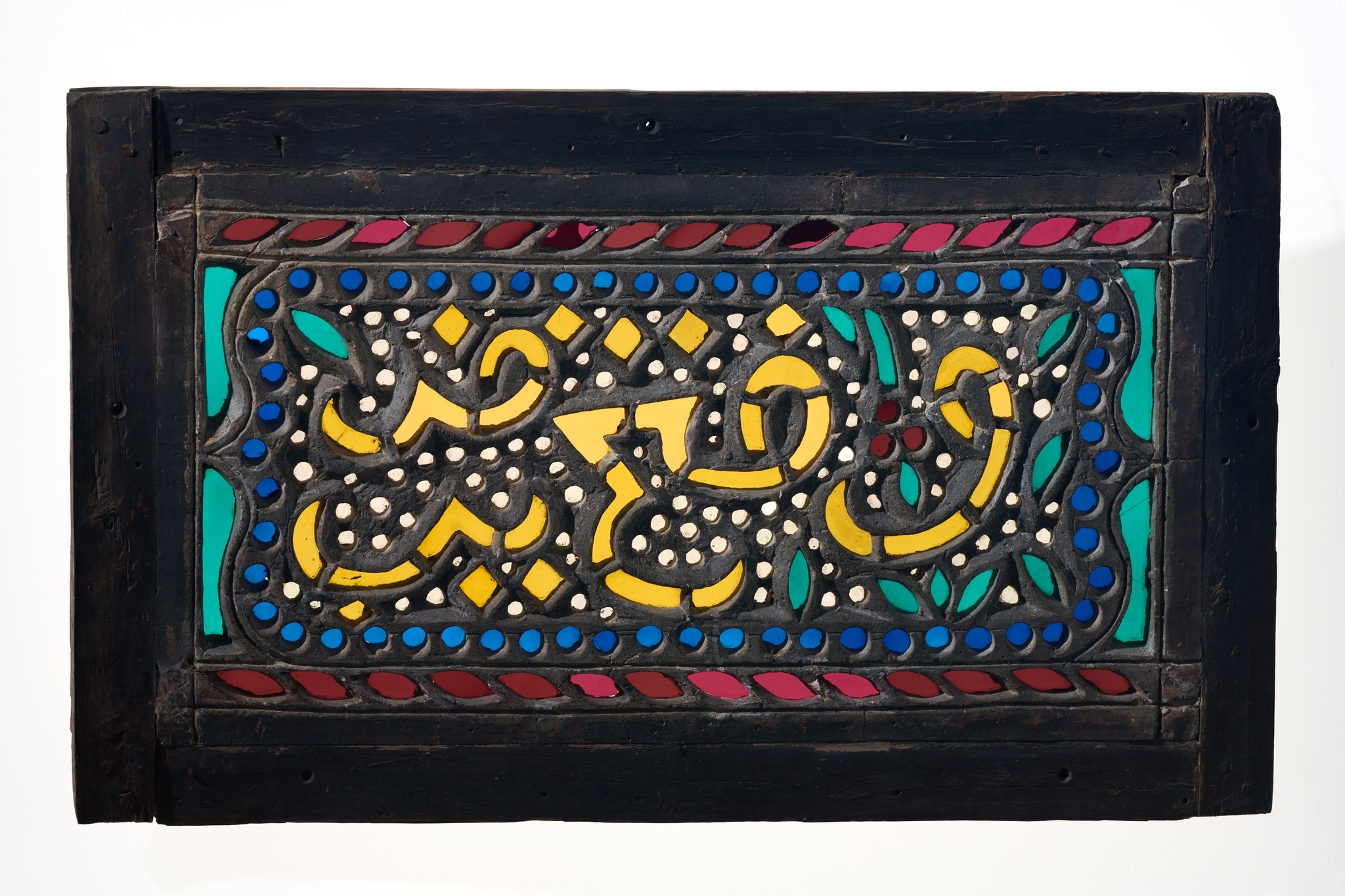 Latticework carved into a rectangular stucco panel and inlaid with pieces of colourless and coloured sheet glass.