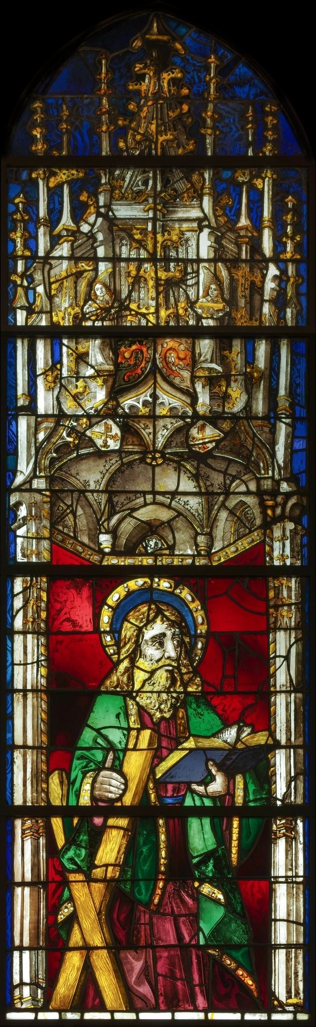 Le vitrail représente sur un fond damassé bleu saint André de trois-quarts, barbu et nimbé, vêtu d’un riche manteau bordé d’orfroi. Il tient de la main gauche un livre ouvert et de la droite la croix en X de son martyre. Il est debout en pied sous un dais architectural percé de trois fenêtres, devant une tenture damassée rouge. L’architecture flamboyante du baldaquin est ornée de deux statuettes d’anges musiciens et de deux écus armoriés.