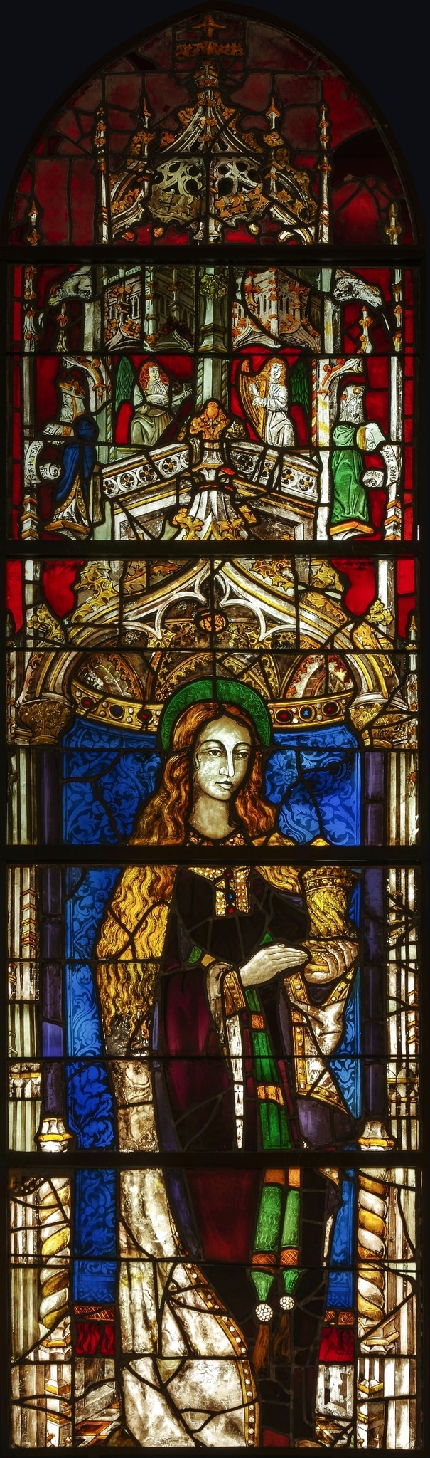 Le vitrail représente sur un fond rouge sainte Marie-Madeleine de trois-quarts, nimbée et vêtue d’un riche manteau doublé d’hermine et bordé d’orfroi, agrémenté d’une étoffe galonnée nouée autour de sa taille, dont les pompons de pierreries descendent presque jusqu’à ses pieds. Elle porte de la main gauche un vase à onguent. Elle se tient en pied sur un sol carrelé, sous un dais architectural, devant une tenture damassée bleue. L’architecture flamboyante du dais forme un balcon abritant deux statuettes d’anges musiciens, flanqués de deux petits baldaquins surmontés de gargouilles, abritant des prophètes tenant des phylactères. La clé de voûte est ornée d’un petit écu armorié.