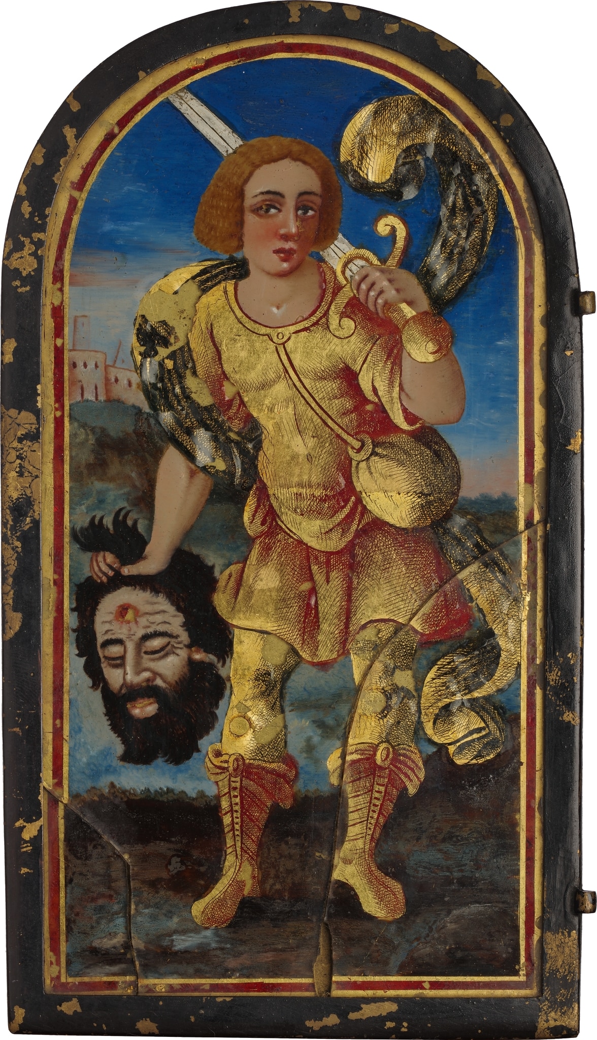 Peinture sous verre représentant David debout, vêtu de doré, tenant de la main gauche une épée et de la droite la tête de Goliath. Dans le fond à gauche, deux habitations sur une colline se détachent d’un ciel rose et bleu.