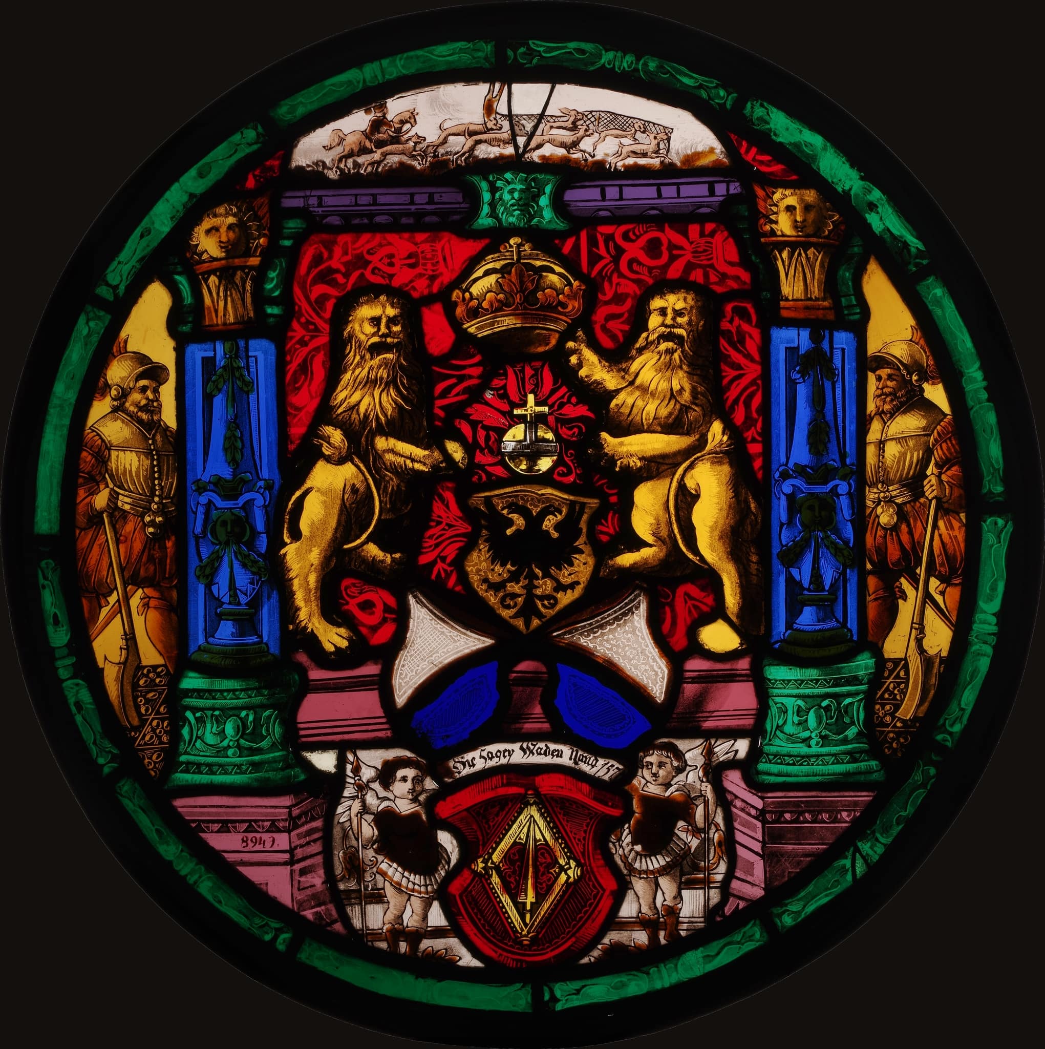 En bas de ce médaillon circulaire deux putti tenant une lance encadrent les armoiries de la commune de Wädenswil qui sont surmontées de deux blasons aux armes de Zurich et de celui du Saint-Empire présentés en pyramide, au-dessus de laquelle se présente un orbe crucifère surmonté de la couronne impériale. Elle est soutenue par deux lions debout, le corps de profil et leur tête de face.