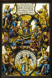 Bien que les vitraux complets ne puissent pas être attribués avec certitude à un peintre verrier en particulier, la présence d’allégories dans les écoinçons et la composition de la représentations centrale rappellent les travaux du peintre verrier zurichois Christoph Murer (1558-1641) et plus particulièrement de son vitrail du Jugement de Salomon daté de 1598 conservé au Bayerische Staatsgemäldesammlungen (inv. 5377). Les dessins de Murer étaient particulièrement appréciés et ont beaucoup circulé dans les ateliers de peintres verriers. Il ne serait donc pas surprenant que ses travaux aient servi de modèles à la composition de ces vitraux.