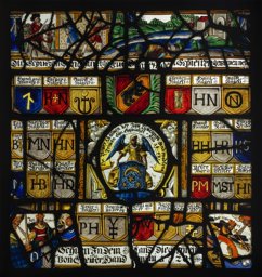 Un petit médaillon ovale armorié inséré au centre d’un vitrail d’une corporation de tir bernoise faisant également partie de la collection du Musée Ariana (GE_2121) possède la même date que celui du panneau bernois (BE_1580) et est similaire dans sa forme, sa composition et son style. Ce fragment armorié provient probablement du présent vitrail fragmentaire du Jugement de Salomon. Les donateurs du panneau seraient ainsi le couple Peter Wälti, lieutenant, et Magdalena Tritten. A ce jour, nous ne possédons pas plus d’informations sur les commanditaires. Comme les couples des vitraux bernois (BE_1579, BE_1580) cités ci-dessus sont originaires d’Oberhasli (BE), il est à supposer que Wälti et Tritten vivaient également dans cette région.