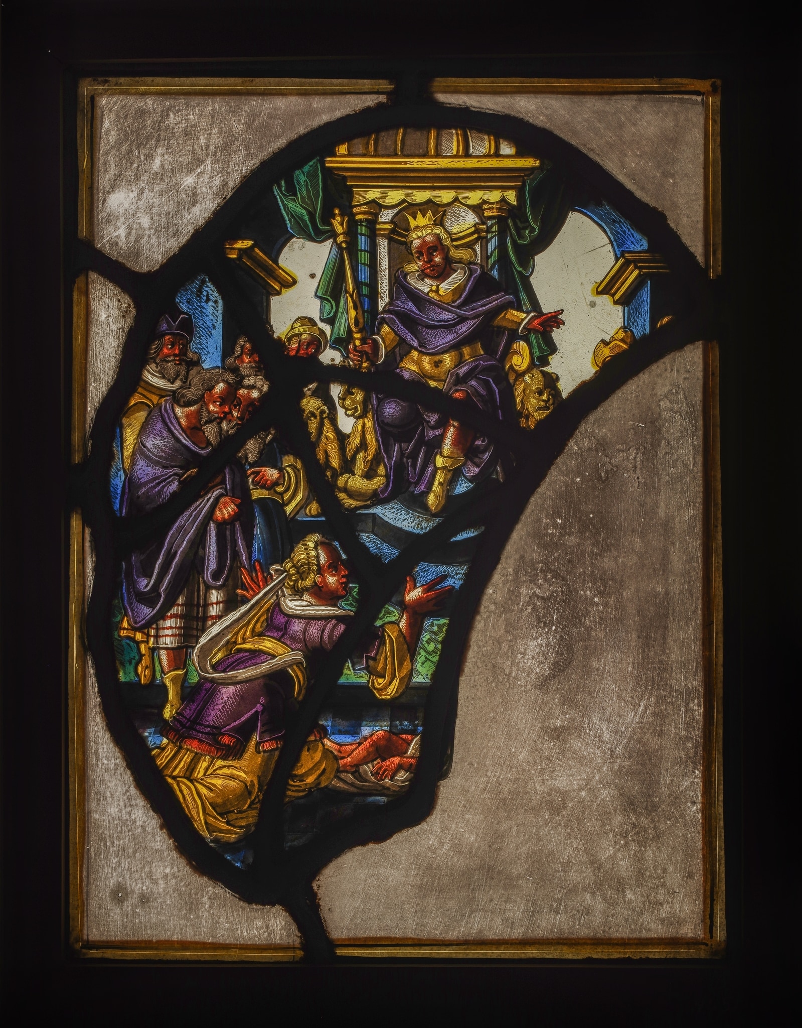 Ce vitrail fragmentaire apparaît dans son intégralité sur un panneau conservé à Berne, donné en 1648 par les couples Peter Furer-Magdalena Ambühl et Peter Neyger-Rosina Ambühl (BE_1580). Le centre du panneau représente à l’identique le Jugement de Salomon, encadré par une couronne de feuilles et de fruits. Compte tenu de la ressemblance avec ce vitrail bernois, il est possible d’imaginer que les parties manquantes du présent fragment étaient similaires. La partie inférieure droite devait ainsi figurer la seconde mère se disputant l’enfant vivant avec la première, et un soldat en armure dégainant son épée du fourreau afin d’exécuter la sentence du souverain. De part et d’autre, il est possible qu’il y ait également eu des figures féminines incarnant les allégories de la Justice, de la Prudence, de la Charité et de la Patience. Dans la partie supérieure se trouvait probablement un cartouche avec une légende biblique relative à la scène centrale. La partie inférieure devait figurer les armes des donateurs, tenues par un ange et encadrées d’une inscription.