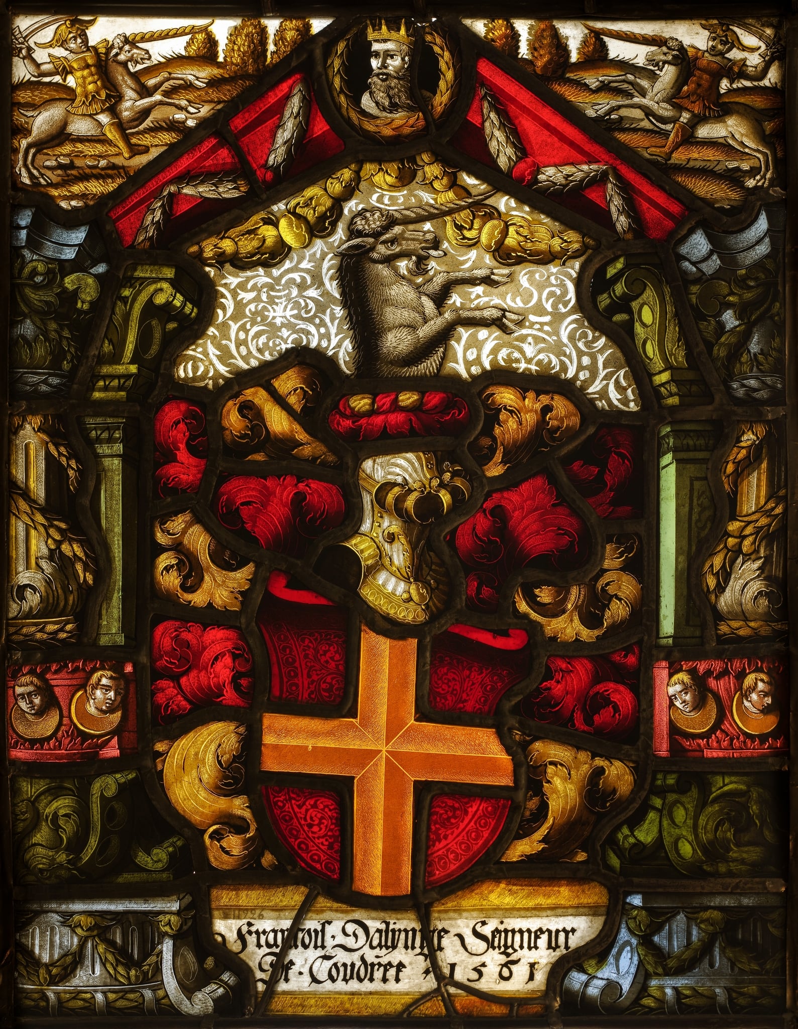 Ce vitrail a été donné en 1561 par François d’Allinges († après 1572) en tant que seigneur de Coudrée. Ses armoiries permettent de le rattacher à la branche issue de Genève. Son mariage avec Marguerite de Colombier a également fait de lui un seigneur de Colombier.
