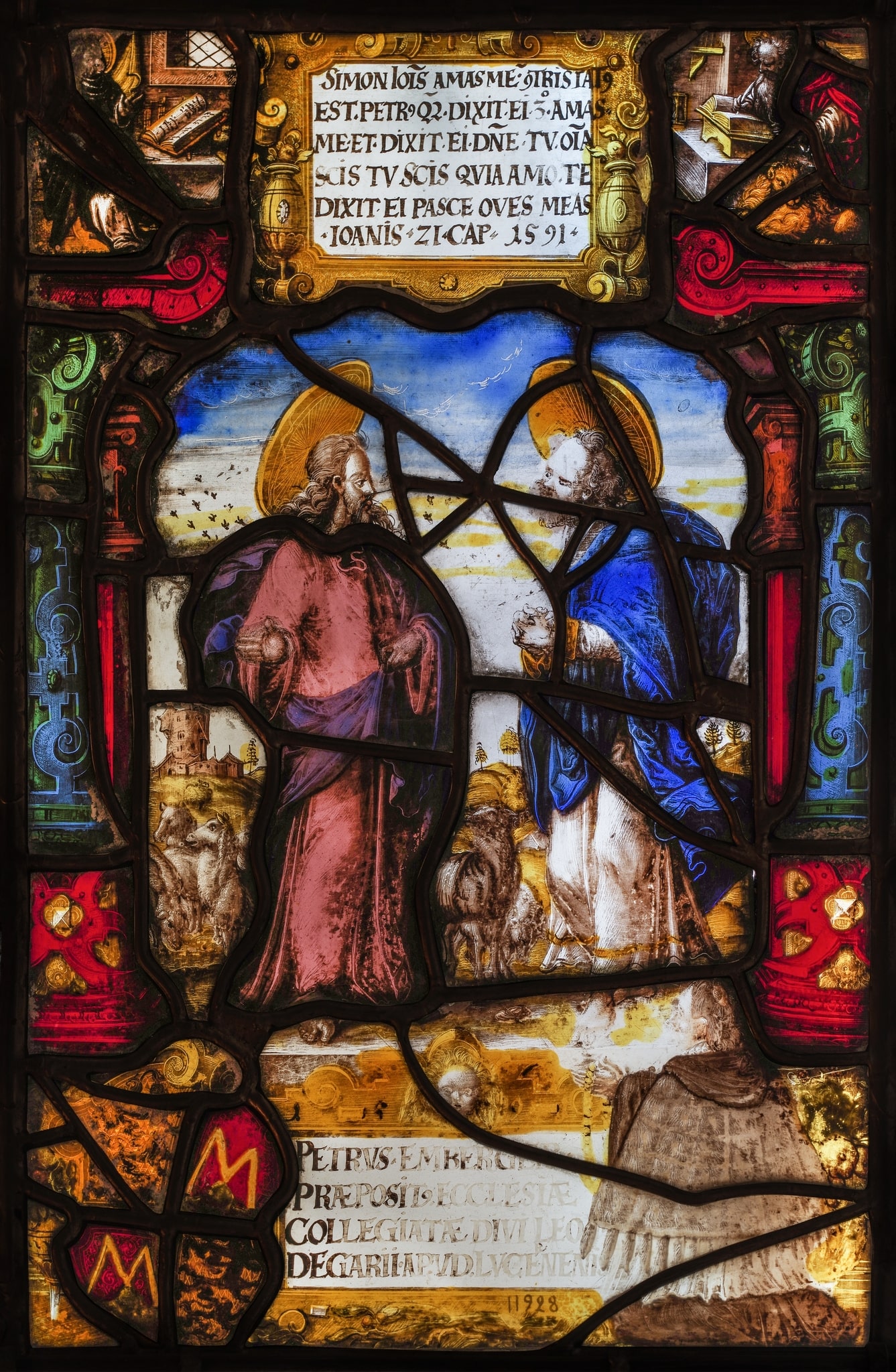 Le vitrail a été commandé en 1591 par le Lucernois Peter Emberger (1557-1611) en tant que prévôt du chapitre de la collégiale Saint-Léger de Lucerne, fonction qu’il a occupée de 1589 à 1591 (Brülisauer, 2004). Saint Pierre représenté en conversation avec le Christ ressuscité, illustrant le passage de Jean 21:15-18, fait référence au saint en tant que patron du donateur. Les personnages nimbés représentés dans les écoinçons, dont la lecture est rendue difficile par les plombs de casse, ne sont pas identifiés avec certitude. Alors que Deonna (1926, p. 26) a proposé d’y voir saint Léger, évêque et patron de l’église, lisant et écrivant, la différence des représentations et l’absence d’attributs épiscopaux invitent plutôt à y voir deux autres personnages. Celui de gauche lisant, imberbe et vêtu d’un costume monacal noir et blanc, n’est pas identifié. Celui de droite, portant une longue barbe blanche et un vêtement rouge et blanc, écrivant à côté d’un sablier avec un lion à ses pieds, pourrait être saint Jérôme.