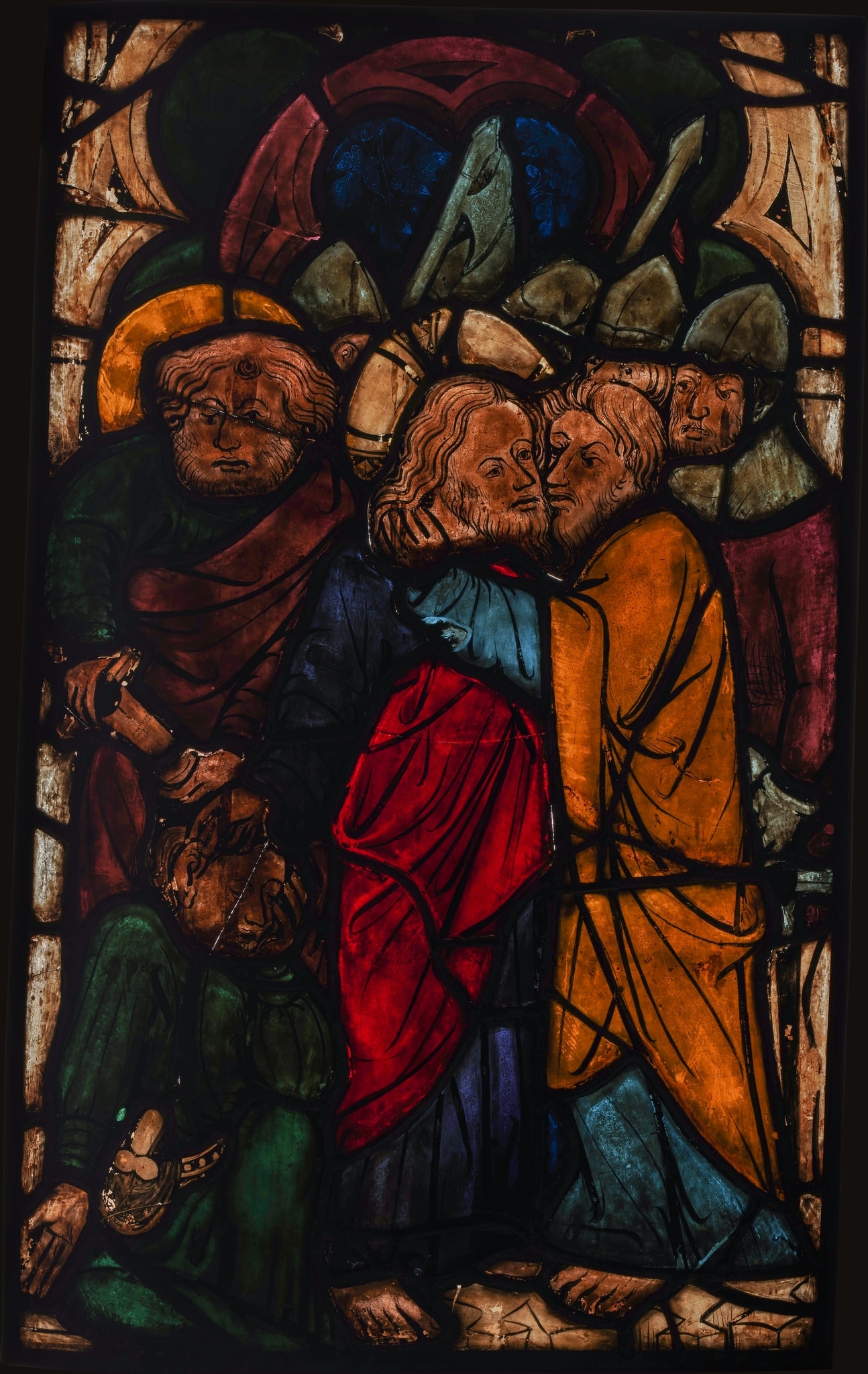 Ce vitrail va de paire avec le couronnement architectural de mêmes dimensions (GE_2057). Ils font partie d’un ensemble de quatre verrières, aujourd’hui conservées au Musée Ariana à Genève, représentant Jésus devant Caïphe (GE_2054) et le Baiser de Judas (GE_2056) surmontés de panneaux architecturaux (GE_2055 et GE_2057). A l’origine, ce cycle dédié à la Passion du Christ était probablement composé de dix vitrages insérés dans au moins deux des cinq baies du choeur de l’ancienne chapelle du château en ruine de Pottendorf, situé en Basse-Autriche (Frodl-Kraft, 1994). Seuls ces deux épisodes ont subsisté. Compte tenu de leur proximité tant narrative qu’iconographique, il est possible qu’ils aient initialement été disposés côte à côte, dans la partie haute (niveau 4 et 5) de la fenêtre gauche du choeur, jouxtant celle axiale (Wais-Wolf, Buchinger & Oberhaidacher-Herzig, 2017, p. 318).