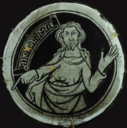 Ce vitrail forme un ensemble avec deux autres médaillons monolithes de sujet, de style et de technique identiques (GE_2063 et GE_2065), également conservés au Musée Ariana à Genève. Selon Lapaire (1980, p. 26), ce groupe formerait un ensemble avec un quatrième médaillon similaire, “simplement décoré d’une bordure polylobée”. Comme il n’est pas possible d’associer les représentations des trois (ou quatre) médaillons à un groupe de personnages identifiés, il est possible que les rondels aient fait partie d’un cycle plus vaste, composé de plus de figures. Compte tenu de leur phylactère et de leur gestuelle, les personnages pourraient ainsi illustrer les prophètes bibliques. Cette hypothèse a également été avancée par Lapaire (1980, p. 26) pour l’identification de l’homme barbu plus âgé (GE_2064). Les autres interprétations des figures évoquées par Lapaire (1980, p. 26), voyant les personnages comme des évangélistes ou des allégories des saisons sont peu probables en raison de l’absence d’attributs spécifiques.