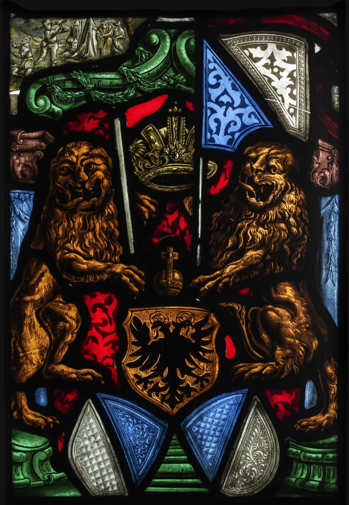 Le vitrail semble être un assemblage de pièces anciennes et modernes réalisé au XIXe siècle. Son cadrage très resserré, coupant des éléments des bordures, et les deux lions regardant de face (plutôt que la traditionnelle paire de lions l’un de face et l’autre de profil) pourraient en attester, tout comme le manque de cohérence des blasons qui porte à confusion quant à savoir s’il s’agit de Zurich ou de Lucerne. Cependant, l’hypothèse indiquant que le lion au bâton portait lui aussi un étendard aujourd’hui disparu peut être discutée. En effet, les compositions similaires représentant plus souvent un lion portant une bannière et l’autre une épée (Schneider, 1971, n° 288, 323, 352 et BE_6398) que chacun un étendard (Schneider, 1971, n° 308).