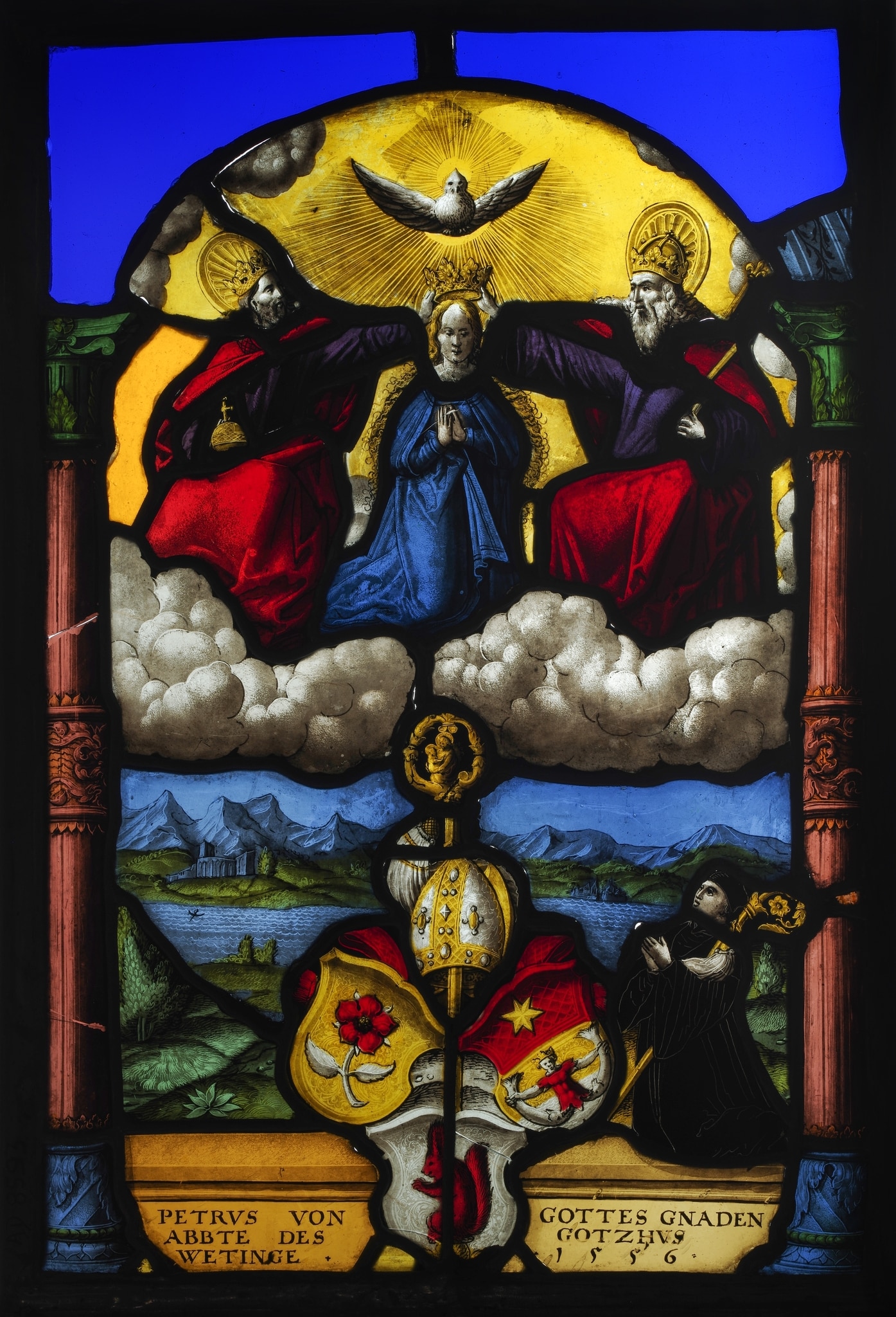 Vitrail aux armes de Peter Eichhorn, abbé de Wettingen, avec Couronnement de la Vierge