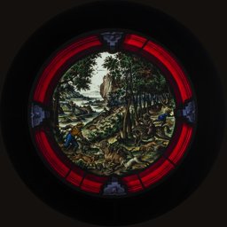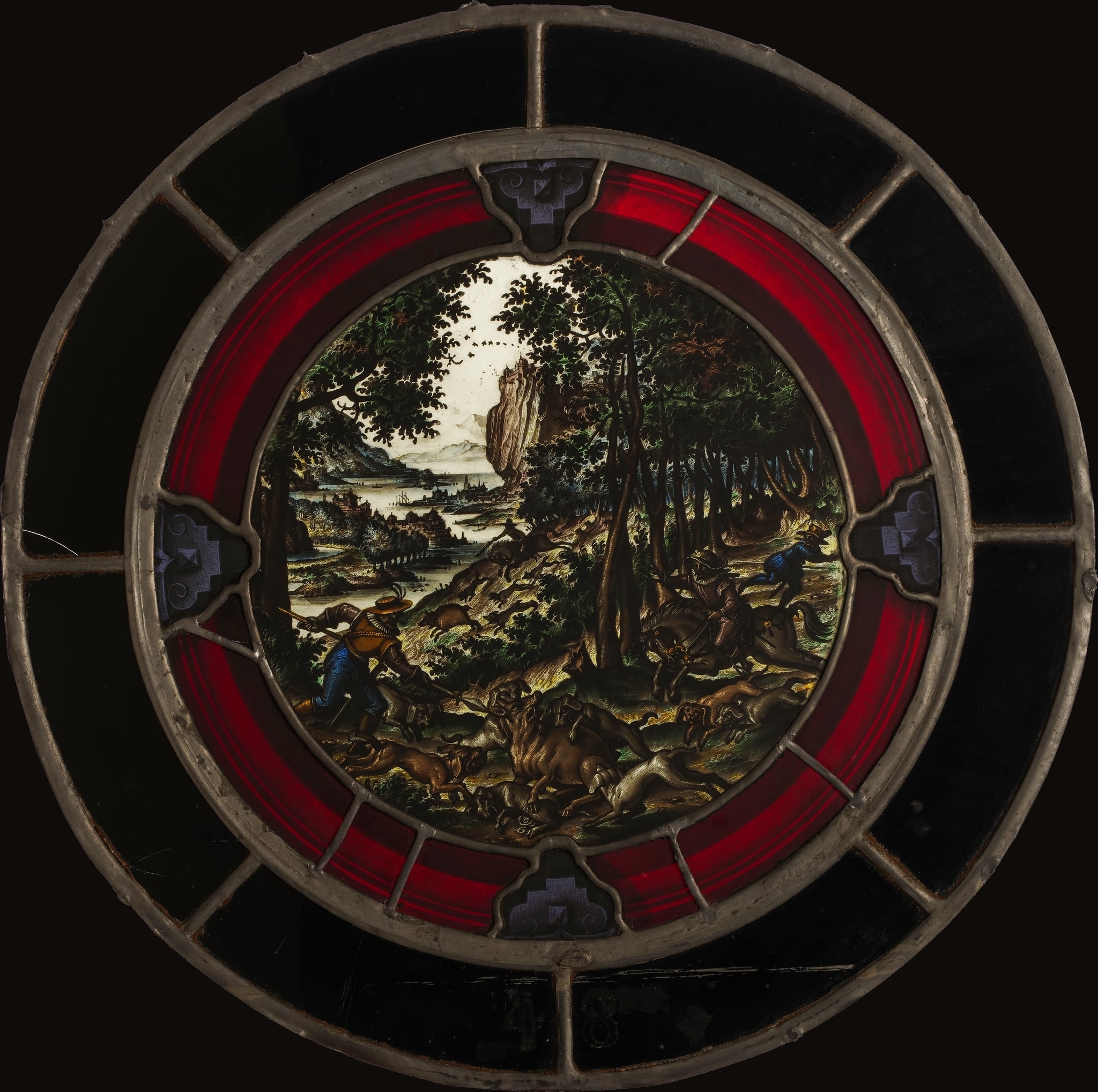 Ce panneau est une oeuvre du peintre verrier zurichois Christoph Murer (1558-1614) dont le monogramme apparaît dans la bordure inférieure droite. Il s’agit probablement d’une commande d’une corporation, comme il en recevait beaucoup au tournant du XVIIe siècle, période où il travaillait dans son atelier zurichois avec son frère Josias Murer (Oberli, 2012). Cette supposition est corroborée par l’existence d’autres scènes de chasses réalisées par Murer à destination de corporations.