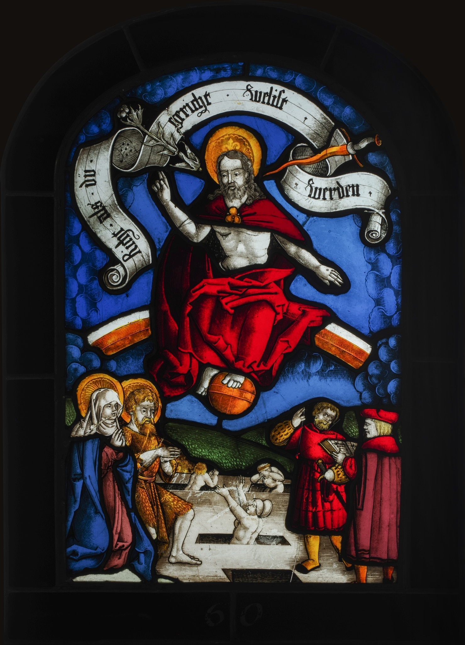 Peu d’informations nous sont parvenues sur ce vitrail du Jugement dernier. Il est fréquent dans ce type de représentations de voir figurer la Vierge Marie et saint Jean-Baptiste intercédant auprès du Christ pour les âmes des défunts. Les figures profanes représentées à droite, un peu plus petites que les saints personnages de gauche, pourraient être les donateurs du vitrail, exerçant peut-être dans le milieu juridique. L’inscription “Juge comme tu veux être jugé” appuie cette hypothèse, car elle n’est pas directement issue de la Bible, mais évoque la justice de manière générale.