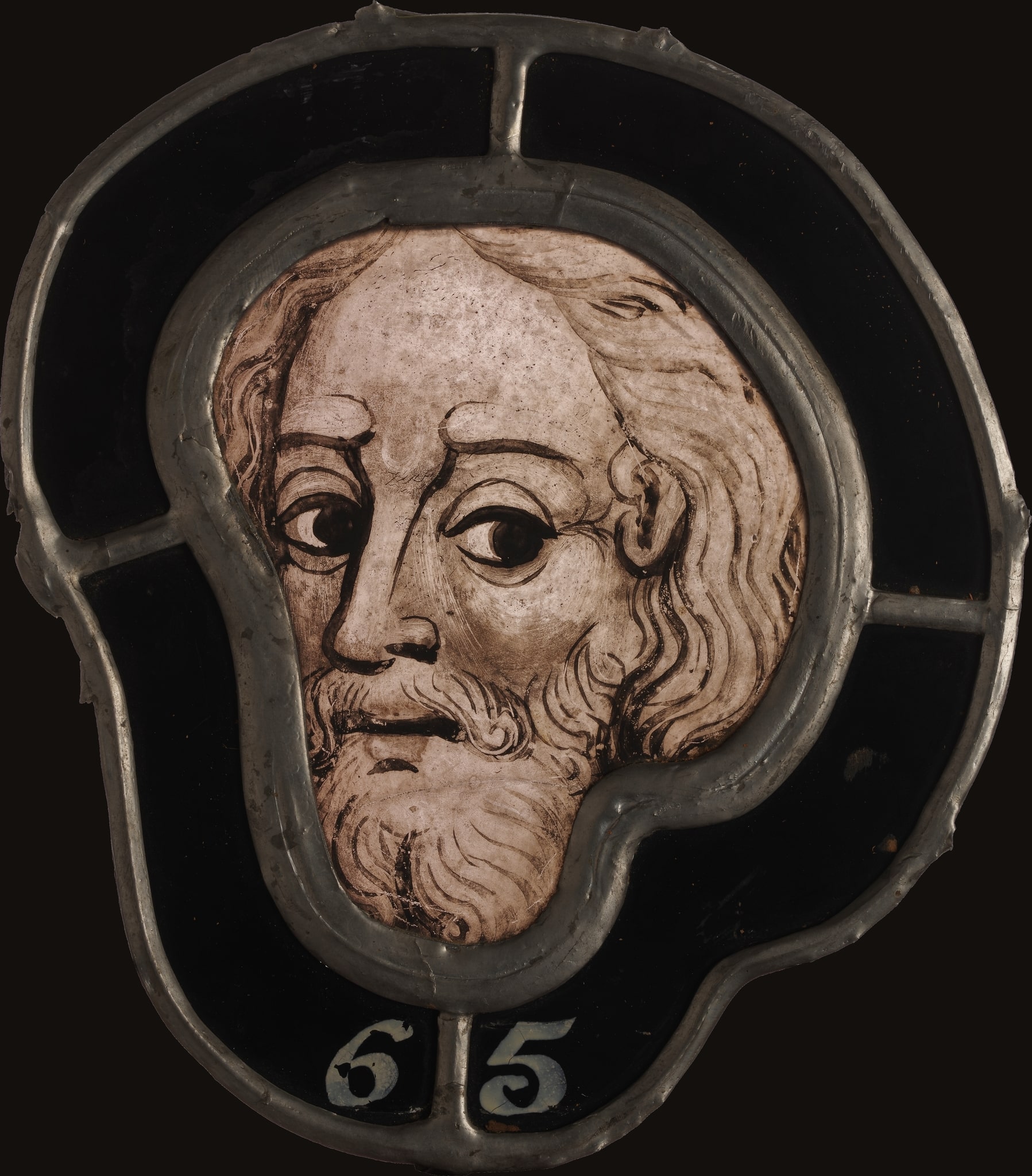 Fragment de vitrail représentant la tête d’un personnage masculin barbu. Il est encadré d’une bordure de verre moderne noir.