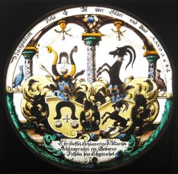 Médaillon représentant un écu armorié surmonté d’un heaume empanaché et d’un cimier à deux ailes, devant un décor architectural composé de colonnes et de piliers soutenant des arcs cintrés. Le soubassement présente un cartouche avec une inscription du donateur. La composition est bordée en haut d’une banderole avec une inscription biblique et en bas d’une demi-couronne de feuilles.