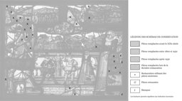 Vitrail au plomb, verre incolore et coloré, verre doublé gravé, grisaille, jaune d’argent, sanguine, émail bleu