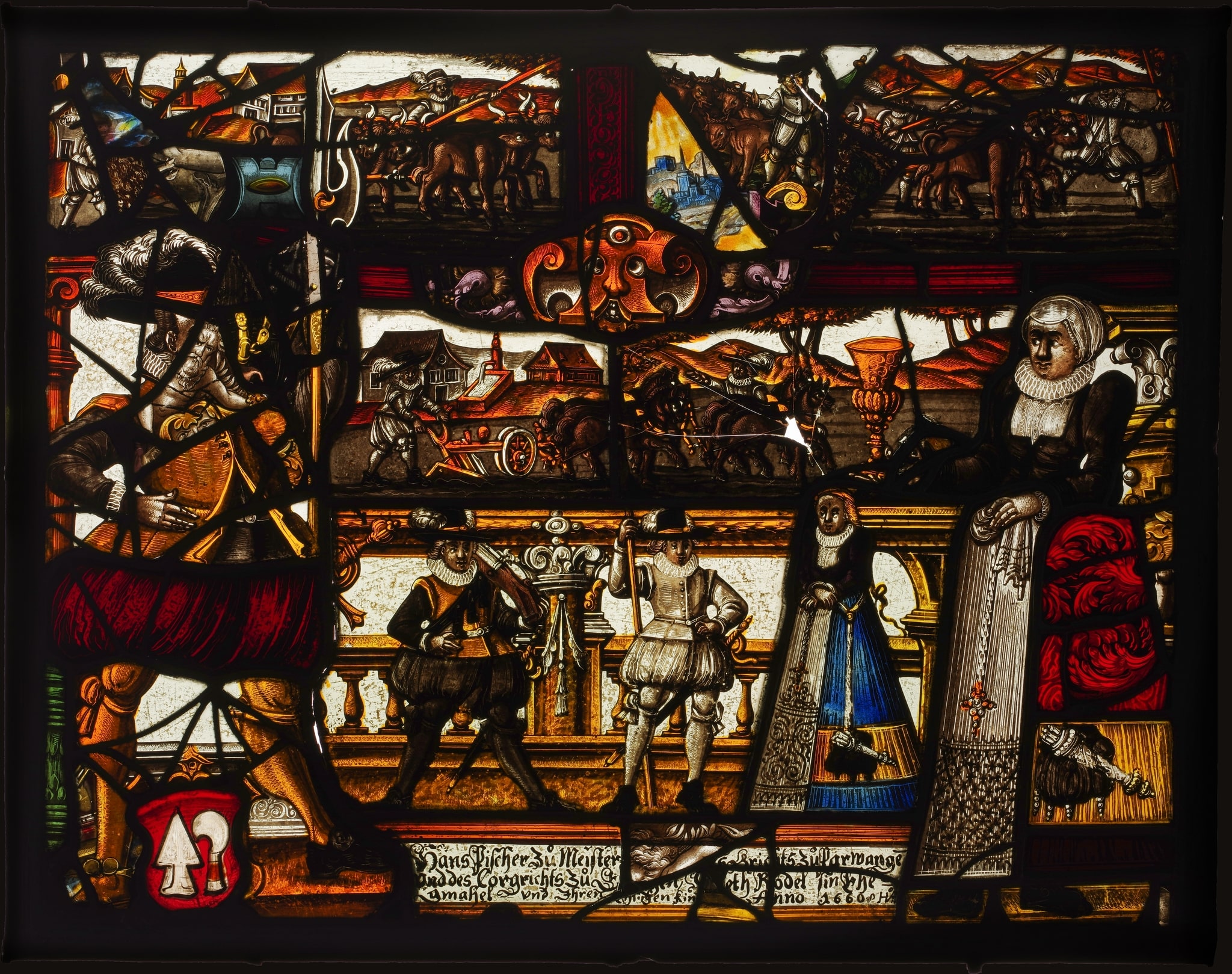 Ce vitrail de bienvenue, donné en 1660, montre les donateurs, le juré d’Aarwangen (BE) Hans Fischer et sa femme Élisabeth Rodel, en compagnie de leur fille et de leurs deux fils. Les armes du donateur et les scènes agricoles représentées dans la partie supérieure du panneau indiquent qu’il s’agissait d’une famille paysanne fortunée.