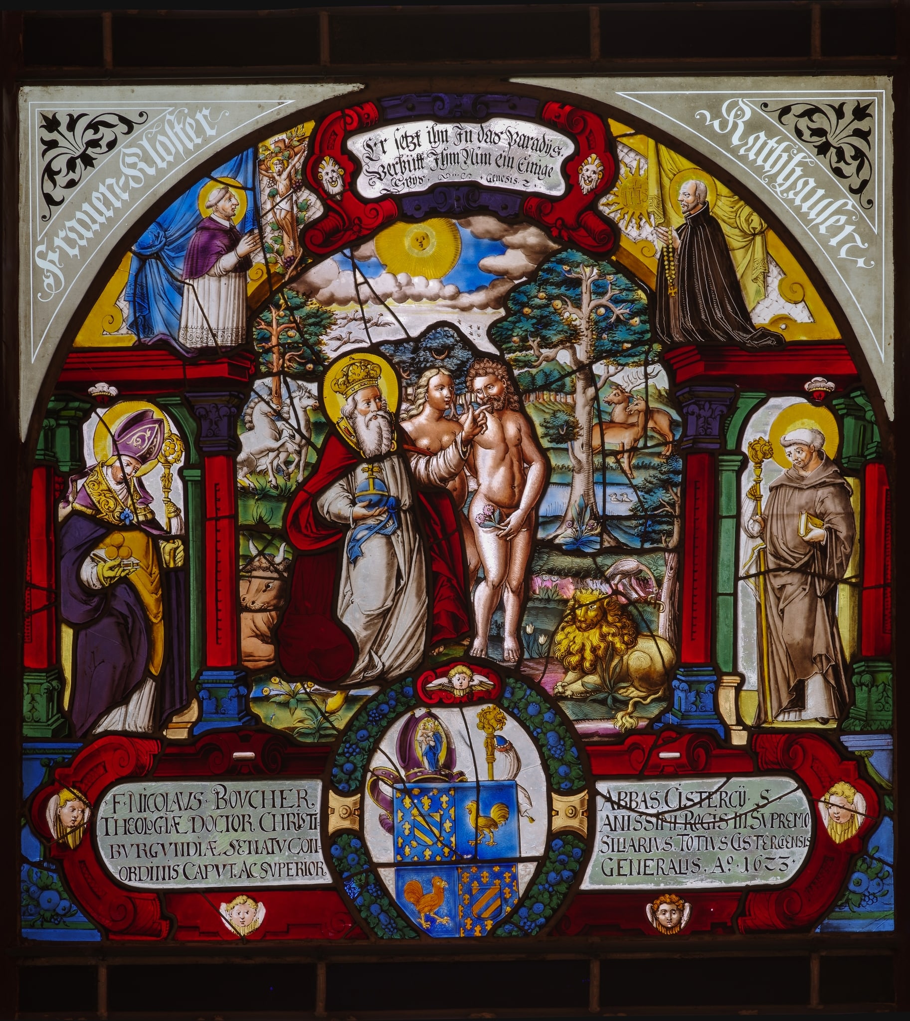 Vitrail aux armes de Nicolas II Boucherat, abbé de Cîteaux, avec Adam et Eve dans le jardin d’Eden