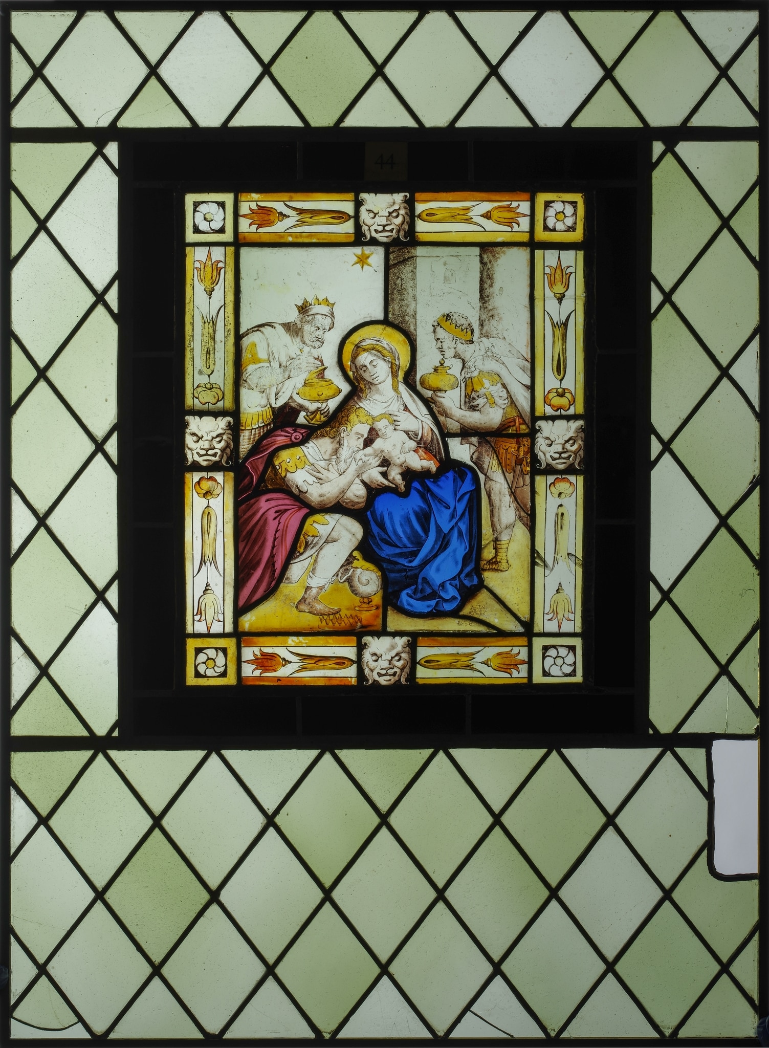 Vitrail rectangulaire représentant l’Adoration du Christ par les mages. Au centre se trouvent l’Enfant et la Vierge Marie surmontés de l’étoile et entourés par les rois qui s’inclinent en offrant leurs présents. La composition centrale est encadrée dans une bordure ornée de fleurs, de rosaces et de mascarons, elle-même montée dans un pourtour moderne noir et dans une vitrerie à losanges du XIXe siècle.